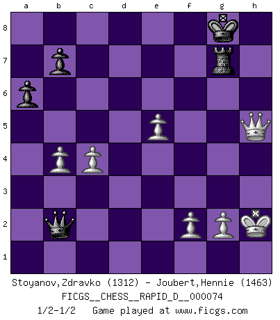 Last move : 1/2-1/2 2013 February 1 16:28:39 [Event "FICGS__CHESS__RAPID_D__000074"] [Site "FICGS"] [Date "2012.12.25"] [Round "1"] [White "Stoyanov,Zdravko"] [Black "Joubert,Hennie"] [Result "1/2-1/2"] [WhiteElo "1312"] [BlackElo "1463"] 1.e4 c5 2.Nf3 e6 3.d3 Nc6 4.Be2 d6 5.a3 Nf6 6.h3 Be7 7.O-O O-O 8.Re1 Bd7 9.c3 Qc7 10.Nbd2 d5 11.b4 cxb4 12.axb4 a6 13.exd5 Nxd5 14.Bb2 Nf4 15.Ne4 Nxe2+ 16.Qxe2 Rac8 17.Qe3 f5 18.Ned2 Bf6 19.Nc4 e5 20.Ncxe5 Nxe5 21.Nxe5 Rce8 22.d4 Bb5 23.Qf4 g6 24.Re3 Qc8 25.Rae1 g5 26.Qf3 f4 27.Re4 Kg7 28.Nd3 Bc6 29.Ne5 Bxe4 30.Rxe4 Bxe5 31.Rxe5 Rxe5 32.dxe5 Re8 33.Qh5 h6 34.h4 Qe6 35.hxg5 Qg6 36.gxh6+ Kh7 37.Qh3 Rg8 38.c4 Qb1+ 39.Kh2 Qxb2 40.Qf5+ Kxh6 41.Qxf4+ Kg7 42.Qf6+ Kh7 43.Qf7+ Rg7 44.Qh5+ Kg8 1/2-1/2 Sicilian defense Kingside Castling by player White (move 7) Kingside Castling by player Black (move 7) This chess game ended in a draw. Follow this game move after move (download)Who is your opponent tonight, tonight I am playing against the Black pieces. (Akiba Rubinstein) Jeder weiß, dass Gasprom Putins persönliches Machtinstrument ist. Die Firma wird vom Kreml aus geleitet und wird schon deshalb nie transparent sein. (Garry Kasparov) En partidas rápidas, el Caballo es mas poderoso que el Alfil. (Vlastimil Hort) On croit qu'il y a plus de mauvais joueurs que de bons joueurs, c'est faux : Il y a autant de joueurs qui gagnent que de joueurs qui perdent. (Philippe Geluck) Either move or be moved. (Ezra Pound)