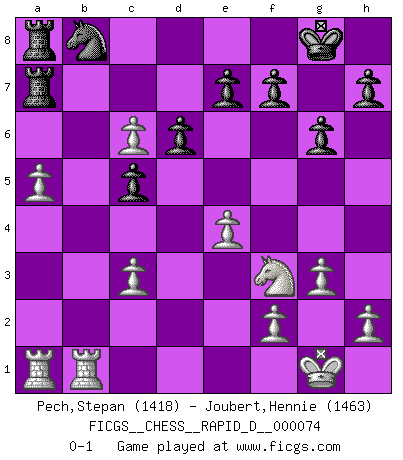 Last move : 0-1 2013 May 18 10:51:37 [Event "FICGS__CHESS__RAPID_D__000074"] [Site "FICGS"] [Date "2012.12.25"] [Round "1"] [White "Pech,Stepan"] [Black "Joubert,Hennie"] [Result "0-1"] [WhiteElo "1418"] [BlackElo "1463"] 1.d4 Nf6 2.c4 c5 3.d5 b5 4.cxb5 a6 5.bxa6 g6 6.Nc3 Bg7 7.Nf3 O-O 8.e4 d6 9.Be2 Bxa6 10.O-O Nbd7 11.Bxa6 Rxa6 12.Qc2 Qb6 13.a4 Rfa8 14.Nb5 Ne8 15.Bd2 Nc7 16.Nxc7 Qxc7 17.a5 R6a7 18.Rfb1 Nb8 19.g3 Na6 20.Bc3 Bxc3 21.bxc3 Nb8 22.Qa4 Nd7 23.Qc6 Qxc6 24.dxc6 Nb8 0-1 This chess game has been lost on time (started : 2012.12.25 2:26:35) Benko gambit accepted Kingside Castling by player Black (move 7) Kingside Castling by player White (move 10) Player Black won this chess game. Follow this game move after move (download)If Chess is a science, it's a most inexact one. If Chess is an art, it is too exacting to be seen as one. If Chess is a sport, it's too esoteric. If Chess is a game, it's too demanding to be just a game. If Chess is a mistress, she's a demanding one. If Chess is a passion, it's a rewarding one. If Chess is life, it's a sad one. (Unknown) Der Vorposten provoziert a) eine Basis für neue Angriffe und b) eine Schwächung der gegnerischen Widerstandskraft in der fraglichen Linie. (Aaron Nimzowitsch) El jugador táctico debe saber que hacer cuando algo se debe de hacer. El estratégico debe saber que hacer cuando nada se debe de hacer. (Savielly Tartakover) Une platitude souvent récitée à propos des Echecs est qu'une des choses les plus difficiles à réaliser est de gagner une position gagnante. Cela ne manque pas de sens mais, pour ma part, j'ai toujours trouvé plus difficile de gagner une position perdante. (Tim Krabbe) Now be brave and don't look back. Don't look back. (Shmi Skywalker in Star Wars ep.1)