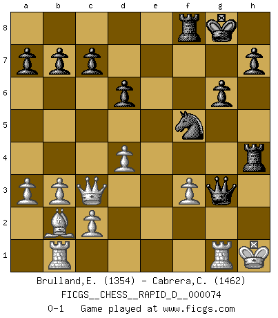 Last move : 0-1 2013 January 11 21:58:57 [Event "FICGS__CHESS__RAPID_D__000074"] [Site "FICGS"] [Date "2012.12.25"] [Round "1"] [White "Brulland,Emmanuel"] [Black "Cabrera,Claudio"] [Result "0-1"] [WhiteElo "1354"] [BlackElo "1462"] 1.b3 e5 2.Bb2 Nc6 3.g3 g6 4.Bg2 Bg7 5.e3 Nge7 6.Ne2 d6 7.d3 O-O 8.Nd2 Be6 9.O-O Qd7 10.a3 f5 11.h3 Rf7 12.Rb1 f4 13.exf4 Bxh3 14.Ne4 Bxg2 15.Kxg2 Raf8 16.Ng5 Rf5 17.Nh3 Nd8 18.Qd2 Ne6 19.d4 exf4 20.Nhxf4 Nxf4+ 21.Nxf4 Bh6 22.Qb4 Bxf4 23.gxf4 Rxf4 24.f3 Qf5 25.Qc3 Qg5+ 26.Kf2 Qh4+ 27.Kg2 Nf5 28.Rg1 Qg3+ 29.Kh1 Rh4+ 0-1 Nimzovich-Larsen attack : Modern variation Kingside Castling by player Black (move 7) Kingside Castling by player White (move 9) Player Black won this chess game. Follow this game move after move (download)Suddenly it was obvious to me in my analysis I had missed what Fischer had found with the greatest of ease at the board. (Mikhail Botvinnik) Es hat in meinem Leben Zeiten gegeben, in denen das Schachspiel, wenn nicht zum Lebenszweck, so doch zu einem regelrechten Lebensersatz geworden ist. Man fühlt sich in solchen Zeiten nicht so, als besäße man eine göttliche Gabe, sondern eher so, als sei man von ihr besessen. (Garry Kasparov) El tablero es el mundo, las piezas es el fenomeno del universo, las reglas del juego son lo que llamamos leyes de la naturaleza y el jugador del lado opuesto, se encuentra oculto a nuestra vista. (Thomas Huxley) Dieu déplace le joueur, et celui-ci la pièce. Quel Dieu derrière Dieu commence donc la trame ? Arturo Perez-Reverte (prix de littérature policière 1993). In every real man a child is hidden that wants to play. (Friedrich Nietzsche)