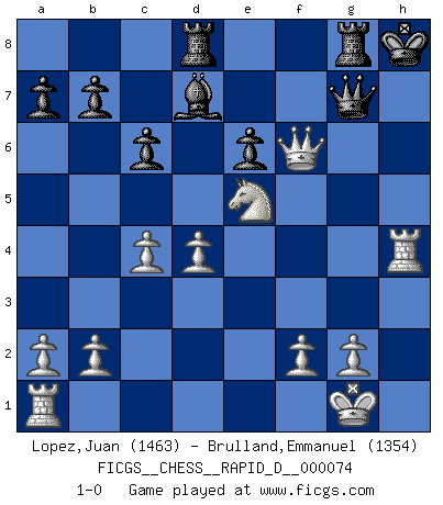 Last move : 1-0 2013 January 16 20:54:25 [Event "FICGS__CHESS__RAPID_D__000074"] [Site "FICGS"] [Date "2012.12.25"] [Round "1"] [White "Lopez,Juan"] [Black "Brulland,Emmanuel"] [Result "1-0"] [WhiteElo "1463"] [BlackElo "1354"] 1.e4 c6 2.d4 d5 3.Nd2 e6 4.Ngf3 Nd7 5.Bd3 dxe4 6.Nxe4 Ngf6 7.O-O Be7 8.c4 O-O 9.Qc2 Nxe4 10.Bxe4 Nf6 11.Bd3 Re8 12.Rd1 h6 13.h3 Bf8 14.Ne5 g6 15.Be3 Bg7 16.Qd2 g5 17.Bc2 Nd7 18.Ng4 Nf6 19.Ne5 Bd7 20.h4 gxh4 21.Bxh6 Nh7 22.Bxg7 Kxg7 23.Bxh7 Kxh7 24.Nxf7 Qe7 25.Qh6+ Kg8 26.Ne5 Rad8 27.Rd3 Qh7 28.Qg5+ Kh8 29.Rh3 Rg8 30.Qf6+ Qg7 31.Rxh4+ 1-0 Caro-Kann : 3.Nd2 Kingside Castling by player White (move 7) Kingside Castling by player Black (move 8) Player White won this chess game. Follow this game move after move (download)The passion for playing Chess is one of the most unaccountable in the world. (H.G. Wells) Ein Gewinn durch eine ungenaue Kombination, sei sie auch noch so vorzeigbar, erfüllt mich mit Schaudern. (Wilhelm Steinitz) Solo los afeminados hacen el Enroque. (Rob Sillars) Le thème de l'attaque double intervient d'une manière ou d'une autre dans l'immense majorité des combinaisons. (Youri Averbakh) When it is a question of money, everybody is of the same religion. (Voltaire)