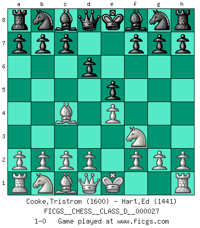 Last move : 1-0 2007 March 4 12:28:16 [Event "FICGS__CHESS__CLASS_D__000027"] [Site "FICGS"] [Date "2007.01.21"] [Round "1"] [White "Cooke,Tristrom"] [Black "Hart,Ed"] [Result "1-0"] [WhiteElo "1600"] [BlackElo "1441"] 1.e4 e5 2.Nf3 d6 3.Bc4 1-0 This chess game has been lost on time (started : 2007.01.21 2:7:59) Philidor's defense Player White won this chess game. Follow this game move after move (download)He who fears an isolated Queen's Pawn should give up Chess. (Siegbert Tarrasch) Wie, soll nun auch die Opposition abgeschafft werden? Ja, es tut mir leid, Ihnen diesen Schmerz nicht ersparen zu können. (Aaron Nimzowitsch) Cuando tu casa esta en llamas, no puedes ser molestado por tus vecinos. O, como decinos en Ajedrez, si tu Rey esta bajo ataque, no te preocupa perder un Peón del lado de la Reina. (Gary Kasparov) Le moment que je préfère le plus dans une rencontre, c'est celui où je sens que la personnalité de l'adversaire se brise. (Robert Fischer) It's not the size of the dog in the fight, it's the size of the fight in the dog. (Mark Twain)