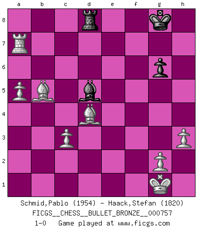 Last move : 1-0 2012 December 25 22:59:55 [Event "FICGS__CHESS__BULLET_BRONZE__000757"] [Site "FICGS"] [Date "2012.12.25"] [Round "1"] [White "Schmid,Pablo"] [Black "Haack,Stefan"] [Result "1-0"] [WhiteElo "1954"] [BlackElo "1820"] 1.d4 d5 2.Bf4 Nf6 3.e3 c5 4.c3 Nc6 5.Nd2 c4 6.Ngf3 e6 7.h3 Be7 8.Be2 O-O 9.O-O a6 10.b3 b5 11.bxc4 bxc4 12.Rb1 Qa5 13.Qc2 g6 14.a4 Nh5 15.Bg5 f6 16.Bh6 Ng7 17.Bf4 e5 18.dxe5 fxe5 19.Nxe5 Nxe5 20.Bxe5 Bf5 21.e4 dxe4 22.Nxc4 e3 23.Qb3 exf2+ 24.Rxf2 Qd8 25.Rd1 Qc8 26.Nb6 Be6 27.Nxc8 Bxb3 28.Nxe7+ Kh8 29.Rxf8+ Rxf8 30.Rd7 Be6 31.Ra7 Re8 32.Nxg6+ hxg6 33.Bxg7+ Kg8 34.Bxa6 Bb3 35.Bb5 Rd8 36.Bd4 Bd5 37.a5 1-0 This chess game has been lost on time (started : 2012.12.25 20:59:37) Queen's pawn, Mason variation Kingside Castling by player Black (move 8) Kingside Castling by player White (move 9) Player White won this chess game. Follow this game move after move (download)We cannot resist the fascination of sacrifice, since a passion for sacrifices is part of a Chessplayer's nature. (Rudolf Spielman) Viele Opfer benötigen überhaupt keine konkrete Berechnung. Es genügt sich die entstehende Position kurz vorzustellen, um uns davon zu überzeugen, dass das Opfer korrekt ist. (Mikhail Nekhemyevich Tal) Las Aperturas te enseñan aperturas. ¡Los Finales te enseñan Ajedrez!. (Stephan Gerzadowicz) Pour moi, les échecs ne sont pas un jeu mais un art. (Alexandre Alekhine) Difficult things take a long time, impossible things a little longer. (Author unknown)