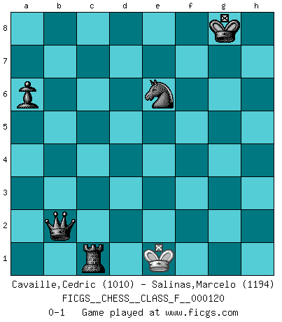 Last move : 0-1 2013 July 10 20:6:16 [Event "FICGS__CHESS__CLASS_F__000120"] [Site "FICGS"] [Date "2012.12.26"] [Round "1"] [White "Cavaille,Cedric"] [Black "Salinas,Marcelo"] [Result "0-1"] [WhiteElo "1010"] [BlackElo "1194"] 1.d4 e6 2.c4 Bb4+ 3.Bd2 Qg5 4.Nc3 Bxc3 5.Bxc3 Nf6 6.Nf3 Qg6 7.e3 d5 8.Qd3 Ne4 9.cxd5 exd5 10.g3 Qf6 11.Bg2 Bh3 12.O-O Bxg2 13.Kxg2 h5 14.Qb5+ Qc6 15.Qxc6+ Nxc6 16.Nd2 f5 17.Nxe4 fxe4 18.b4 b5 19.a4 Rb8 20.a5 a6 21.f3 O-O 22.fxe4 dxe4 23.Rxf8+ Rxf8 24.d5 Ne7 25.Rd1 Rf3 26.d6 cxd6 27.Rxd6 Rxe3 28.Bd2 Re2+ 29.Kg1 e3 30.Bc3 Rc2 31.Be1 Nc6 32.Re6 e2 33.Kf2 Rc4 34.Kxe2 Nd4+ 35.Kd3 Nxe6 36.h3 Ng5 37.g4 hxg4 38.hxg4 Rxg4 39.Bd2 Ne6 40.Ke3 g5 41.Kf3 Rd4 42.Bxg5 Nxg5+ 43.Ke3 Rxb4 44.Kd3 Ra4 45.Ke3 b4 46.Kf4 Rxa5 47.Ke3 b3 48.Kd2 Rc5 49.Kd3 b2 50.Kd4 Ne6+ 51.Ke3 b1Q 52.Kf3 Qb4 53.Ke3 Rc3+ 54.Kd2 Qb2+ 55.Ke1 Rc1+ 0-1 Queen's pawn : Franco-Indian (Keres) defense Kingside Castling by player White (move 12) Kingside Castling by player Black (move 21) 10 pieces endgame at move 38 : White KBPP , Black KRNPPP WHITE : King + 1 Bishop 2 Pawns BLACK : King + 1 Rook 1 Knight 3 Pawns 9 pieces endgame at move 42 : White KBPP , Black KRNPP WHITE : King + 1 Bishop 2 Pawns BLACK : King + 1 Rook 1 Knight 2 Pawns 8 pieces endgame at move 42 : White KPP , Black KRNPP WHITE : King + 2 Pawns BLACK : King + 1 Rook 1 Knight 2 Pawns 7 pieces endgame at move 43 : White KP , Black KRNPP WHITE : King + 1 Pawn BLACK : King + 1 Rook 1 Knight 2 Pawns 6 pieces endgame at move 46 : White K , Black KRNPP WHITE : King + BLACK : King + 1 Rook 1 Knight 2 Pawns Promotion Queen by player Black (move 51) Player Black won this chess game. Follow this game move after move (download)A thorough understanding of the typical mating continuations makes the most complicated sacrificial combinations leading up to them not only not difficult, but almost a matter of course. (Siegbert Tarrasch) Alle Schachspieler sollten auch ein Hobby haben. (Savielly Grigorievitsch Tartakower) El Ajedrez es un cuento de Hadas de las 1001 metidas de pata. (Savielly Tartakower) Ce qui caractérise les parties de combat, c'est que si le défenseur a constamment de difficiles problèmes à résoudre, l'attaquant doit chercher sans relâche de nouvelles possibilités d'attaque. (Koblentz) Man with more than one clock never knows what time it is. (Chinese thought)