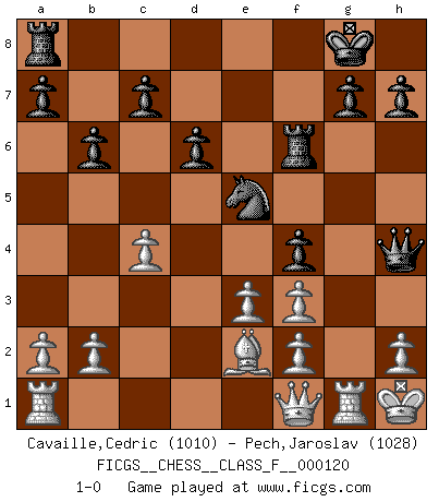 Last move : 1-0 2013 May 7 0:59:18 [Event "FICGS__CHESS__CLASS_F__000120"] [Site "FICGS"] [Date "2012.12.26"] [Round "1"] [White "Cavaille,Cedric"] [Black "Pech,Jaroslav"] [Result "1-0"] [WhiteElo "1010"] [BlackElo "1028"] 1.d4 f5 2.c4 Nf6 3.Nc3 e6 4.Nf3 Bb4 5.Bd2 O-O 6.e3 b6 7.Be2 Bb7 8.O-O Bxc3 9.Bxc3 Ne4 10.Qc2 d6 11.Bd3 Nxc3 12.Qxc3 Bxf3 13.gxf3 Qh4 14.Kh1 Nd7 15.Qe1 e5 16.dxe5 Nxe5 17.Be2 Rf6 18.Rg1 f4 19.Qf1 1-0 This chess game has been lost on time (started : 2012.12.26 17:50:4) Dutch with c4 & Nc3 Kingside Castling by player Black (move 5) Kingside Castling by player White (move 8) Player White won this chess game. Follow this game move after move (download)My opponents make good moves too. Sometimes I don't take these things into consideration. (Bobby Fischer) Im Reiche der Wirklichkeit ist man nie so glücklich wie im Reiche der Gedanken. (Arthur Schopenhauer) Ayuda a tus piezas para que ellas te puedan ayudar. (Paul Morphy) On croit qu'il y a plus de mauvais joueurs que de bons joueurs, c'est faux : Il y a autant de joueurs qui gagnent que de joueurs qui perdent. (Philippe Geluck) Philosophers use a language that is already deformed as though by shoes that are too tight. (Ludwig Wittgenstein)