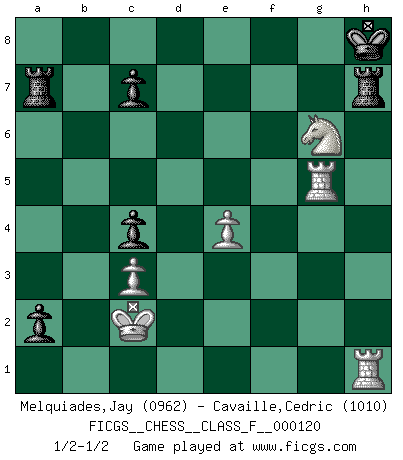 Last move : 1/2-1/2 2013 January 6 22:23:32 [Event "FICGS__CHESS__CLASS_F__000120"] [Site "FICGS"] [Date "2012.12.26"] [Round "1"] [White "Melquiades,Jay"] [Black "Cavaille,Cedric"] [Result "1/2-1/2"] [WhiteElo "0962"] [BlackElo "1010"] 1.e4 e5 2.Nf3 Nc6 3.c3 Nf6 4.d3 d5 5.Bg5 dxe4 6.dxe4 Qxd1+ 7.Kxd1 Bc5 8.Nbd2 Bxf2 9.Bc4 Bc5 10.Kc2 O-O 11.Bxf6 gxf6 12.Rae1 a6 13.Rhf1 Na5 14.b4 Nxc4 15.Nxc4 b5 16.Na5 Bd7 17.bxc5 Be6 18.Nc6 Bxa2 19.Nh4 Bc4 20.Rf3 a5 21.R1e3 Kh8 22.Ne7 a4 23.Nhf5 a3 24.Rf1 a2 25.Ra1 Rae8 26.Nc6 Rg8 27.g3 h5 28.Nh6 Rg6 29.Nf5 h4 30.Nxh4 R6g8 31.h3 Re6 32.Na5 Ra8 33.Nxc4 bxc4 34.Nf3 Kg7 35.Nd2 Ra4 36.g4 Rc6 37.h4 Rxc5 38.Nf3 Kg6 39.h5+ Kh6 40.Nd2 Rb5 41.Rf3 Kg5 42.Rf5+ Kxg4 43.h6 Rb8 44.Rxf6 Rh8 45.Nf1 Kg5 46.Rf5+ Kxh6 47.Rxf7 Ra7 48.Ne3 Rh7 49.Ng4+ Kg6 50.Nxe5+ Kh6 51.Rf6+ Kg5 52.Rf5+ Kh6 53.Rh1+ Kg7 54.Rg5+ Kh8 55.Ng6+ Kg7 56.Nf4 Kh8 57.Ng6+ Kg7 58.Nf4 Kh8 59.Ng6+ 1/2-1/2 Ponziani : Jaenisch counter-attack Kingside Castling by player Black (move 10) This chess game ended in a draw. Follow this game move after move (download)I have never in my life played the French Defence, which is the dullest of all openings. (Wilhelm Steinitz) Im Schach gibt es keinen Platz für Galanterie. (Irving Chernev) Nunca nadie ha ganado una partida de Ajedrez rindiendose. (Unknown) J'ai vu le vaincu d'Echecs jouer des années durant dans l'espoir de la fête de la victoire. Car tu es plus riche de ce qu'elle existe si même elle n'est point pour toi. Ainsi de la perle du fond des mers. (Antoine de Saint-Exupéry) The real danger is not that computers will begin to think like men, but that men will begin to think like computers. (Sydney J. Harris)
