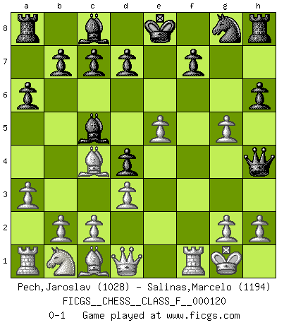 Last move : 0-1 2013 May 26 12:8:30 [Event "FICGS__CHESS__CLASS_F__000120"] [Site "FICGS"] [Date "2012.12.26"] [Round "1"] [White "Pech,Jaroslav"] [Black "Salinas,Marcelo"] [Result "0-1"] [WhiteElo "1028"] [BlackElo "1194"] 1.e4 e5 2.Nf3 Nc6 3.Bb5 Nd4 4.Nxd4 exd4 5.O-O a6 6.Bc4 Qh4 7.d3 Bd6 8.f4 g5 9.e5 Bb4 10.a3 Bc5 11.fxg5 h6 0-1 Ruy Lopez : Bird's defense Kingside Castling by player White (move 5) Player Black won this chess game. Follow this game move after move (download)The isolated Pawn casts gloom over the entire chessboard. (Aaron Nimzovich) Du kannst im Schach nur gut werden, wenn du das Spiel liebst. (Robert James Fischer) Fischer era un maestro de claridad y un Rey del posicionamiento astuto. Sus oponentes podían ver hacia donde se dirigía pero eran impotentes para detenerlo. (Bruce Pandolfini) Il n'y a pas eu de défaite parce que je ne crois pas que cet ordinateur ait jamais existé. IBM a triché en refusant d'imprimer les modes de recherche de la machine. C'est évident, pendant le match, des coups décisifs ont été joués par des êtres humains. Aujourd'hui, les meilleurs spécialistes en informatique ne peuvent toujours pas expliquer comment Deep-Blue a pu jouer contre la logique des ordinateurs. IBM a gagné une guerre de communication, mais ils sont incapables de prouver que l'ordinateur a gagné tout seul. (Garry Kasparov) How many people work in NATO Headquarters ? - About half of them. (Dirk Stikker, NATO general secretary)