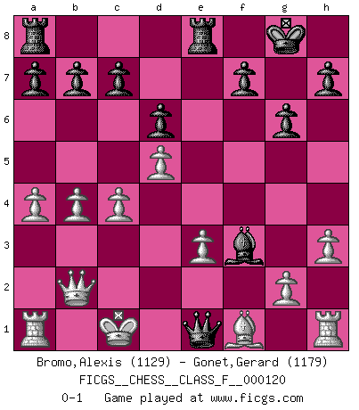 Last move : 0-1 2012 December 27 21:53:33 [Event "FICGS__CHESS__CLASS_F__000120"] [Site "FICGS"] [Date "2012.12.26"] [Round "1"] [White "Bromo,Alexis"] [Black "Gonet,Gerard"] [Result "0-1"] [WhiteElo "1129"] [BlackElo "1179"] 1.d4 Nf6 2.c4 g6 3.Nc3 Bg7 4.Nf3 O-O 5.b4 d6 6.Bb2 Re8 7.Qc2 Bf5 8.Qd2 Nbd7 9.h3 e5 10.d5 e4 11.Nd4 e3 12.fxe3 Ne4 13.Nxe4 Bxe4 14.a4 Qh4+ 15.Kd1 Ne5 16.Nf3 Nxf3 17.exf3 Bxb2 18.Qxb2 Bxf3+ 19.Kc1 Qe1+ 0-1 King's Indian defense, 3.Nc3 Kingside Castling by player Black (move 4) Player Black won this chess game. Follow this game move after move (download)Fischer Chess play was always razor-sharp, rational and brilliant. One of the best ever. (Dave Regis) Mit Schach schule ich mein Gefühl für Geometrie, was für Tennis und Schach gleichermaßen wichtig ist. (Boris Becker) Un mal plan es mejor que no tener ningún plan. (Frank Marshall) J'apprécie les joueurs d'est-indienne, c'est grâce à eux que je nourris ma famille depuis tant d'années. (Petrosian) Hold em is to stud what chess is to checkers. (Johnny Moss)