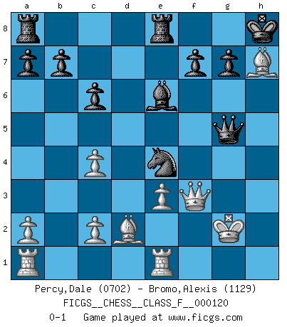 Last move : 0-1 2013 February 7 23:37:13 [Event "FICGS__CHESS__CLASS_F__000120"] [Site "FICGS"] [Date "2012.12.26"] [Round "1"] [White "Percy,Dale"] [Black "Bromo,Alexis"] [Result "0-1"] [WhiteElo "0702"] [BlackElo "1129"] 1.e3 e5 2.g3 Nf6 3.Nf3 Nc6 4.Nc3 d5 5.d3 Bg4 6.Be2 Bb4 7.Bd2 Bxc3 8.bxc3 e4 9.dxe4 Nxe4 10.O-O Bh3 11.Re1 O-O 12.Bb5 Ne7 13.Ne5 c6 14.Be2 Nf5 15.c4 Re8 16.Nf3 d4 17.Bd3 dxe3 18.fxe3 Nfxg3 19.hxg3 Nxg3 20.Ng5 Be6 21.Bxh7+ Kh8 22.Kg2 Qxg5 23.Qf3 Ne4 0-1 Van't Kruijs Opening Kingside Castling by player White (move 10) Kingside Castling by player Black (move 11) Player Black won this chess game. Follow this game move after move (download)Botvinnik tried to take the mystery out of Chess, always relating it to situations in ordinary life. He used to call Chess a typical inexact problem similar to those which people are always having to solve in everyday life. (Garry Kasparov) Schach ist ein Kampf gegen den Fehler. (Johannes Herrman Zukertort) La partida mas dura de ganar es una partida ganada. (Emanuel Lasker) Une platitude souvent récitée à propos des Echecs est qu'une des choses les plus difficiles à réaliser est de gagner une position gagnante. Cela ne manque pas de sens mais, pour ma part, j'ai toujours trouvé plus difficile de gagner une position perdante. (Tim Krabbe) For a mechanic, you seem to do an excessive amount of thinking. (C-3PO in Star Wars ep.2)