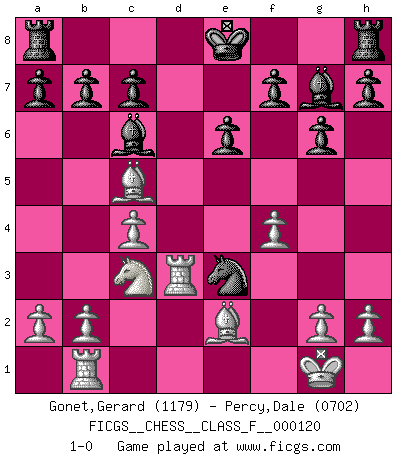 Last move : 1-0 2013 February 7 23:36:27 [Event "FICGS__CHESS__CLASS_F__000120"] [Site "FICGS"] [Date "2012.12.26"] [Round "1"] [White "Gonet,Gerard"] [Black "Percy,Dale"] [Result "1-0"] [WhiteElo "1179"] [BlackElo "0702"] 1.d4 e6 2.c4 d6 3.Nc3 Nf6 4.e4 Nc6 5.Nf3 g6 6.Be2 Bg7 7.e5 dxe5 8.dxe5 Nd7 9.O-O Ndxe5 10.Nxe5 Nxe5 11.Qxd8+ Kxd8 12.f4 Nc6 13.Rb1 Nd4 14.Rd1 Bd7 15.Be3 Nf5 16.Bd2 Nd4 17.Bf1 Nf5 18.Be2 Bc6 19.Be3 Ke8 20.Bc5 Ne3 21.Rd3 1-0 Queen's pawn Kingside Castling by player White (move 9) Player White won this chess game. Follow this game move after move (download)He who fears an isolated Queen's Pawn should give up Chess. (Siegbert Tarrasch) Wie, soll nun auch die Opposition abgeschafft werden? Ja, es tut mir leid, Ihnen diesen Schmerz nicht ersparen zu können. (Aaron Nimzowitsch) El Ajedrez es un cuento de Hadas de las 1001 metidas de pata. (Savielly Tartakower) La solitude du joueur d'Echecs à l'approche du mat est semblable à celle du condamné. (Francis Szpiner) Wawaweewa ! (Borat: Cultural learnings of America for make benefit glorious nation of Kazakhstan)