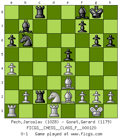 Last move : 0-1 2013 May 26 12:9:0 [Event "FICGS__CHESS__CLASS_F__000120"] [Site "FICGS"] [Date "2012.12.26"] [Round "1"] [White "Pech,Jaroslav"] [Black "Gonet,Gerard"] [Result "0-1"] [WhiteElo "1028"] [BlackElo "1179"] 1.c4 Nf6 2.Nc3 g6 3.d4 Bg7 4.e4 d6 5.Nf3 O-O 6.Be2 e5 7.dxe5 dxe5 8.Qxd8 Rxd8 9.Bg5 Re8 10.Nd5 Nxd5 11.cxd5 c6 12.Bc4 Nd7 13.dxc6 Nb6 14.Bb5 Re6 15.cxb7 Bxb7 16.Nd2 h6 17.Be3 Rc8 18.O-O a6 19.Be2 Rec6 20.Rfd1 Bf8 21.a4 Rc2 0-1 English Opening Kingside Castling by player Black (move 5) Kingside Castling by player White (move 18) Player Black won this chess game. Follow this game move after move (download)Chess is a terrific way for kids to build self image and self esteem. (Saudin Robovic) Der vorletzte Fehler gewinnt. (Savielly Grigorievitsch Tartakower) En la perfecta combinación de Ajedrez como en una historia corta de primera clase, toda la trama y contra trama deberá conducir hacia un final sorprendente, el interes no es mitigado hasta el último momento. (Yates and Winter) Les échecs c'est le défi de l'alpiniste, toujours plus haut, prêt à tout pour monter à l'assaut du Roi ennemi. Les échecs, c'est de la musique en mouvement, un ballet majestueux pour les yeux. C'est de la poésie composée par les fantômes du passé qui au même titre que Rimbaud ou Verlaine méritent notre admiration. Les échecs, c'est de la peinture ou le moindre mouvement modifie le tableau pour en faire un Picasso ou un Van Gogh. Les échecs, c'est tout et rien, c'est la vie et la mort. Jjulie33 sur le forum de France-Echecs. Methinks King Thibault should dub Marius Zubac a knight of the square board... I mean table, henceforth addressing him as Sir Marius, and bestow on him a suitable land from the kingdom of FICGS & marry him off to a worthy, fair maiden, lest he slice our heads with his mighty sword in his wrath. (Dinesh De Silva)