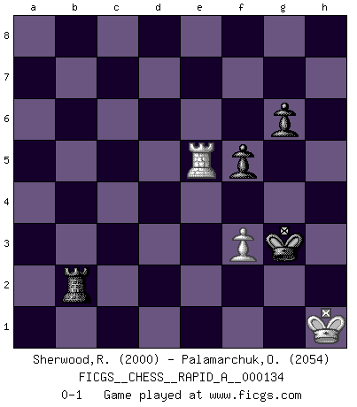 Last move : 0-1 2013 March 2 14:51:52 [Event "FICGS__CHESS__RAPID_A__000134"] [Site "FICGS"] [Date "2013.01.01"] [Round "1"] [White "Sherwood,Russell"] [Black "Palamarchuk,Oleg"] [Result "0-1"] [WhiteElo "2000"] [BlackElo "2054"] 1.e4 c5 2.Nf3 d6 3.d4 cxd4 4.Nxd4 Nf6 5.Nc3 a6 6.Bg5 Nbd7 7.Bc4 e6 8.O-O Qa5 9.Qd2 b5 10.Bd3 Bb7 11.a3 Be7 12.b4 Qc7 13.a4 bxa4 14.Rfe1 O-O 15.Nxa4 Ne5 16.Qe2 d5 17.exd5 Nxd3 18.cxd3 Nxd5 19.Rec1 Qd6 20.Bxe7 Nxe7 21.Nc2 Nd5 22.Qd2 Nf4 23.Ne1 e5 24.Nc5 Bd5 25.Ra5 Rfb8 26.Rca1 Rb6 27.f3 Bc4 28.g3 Ne6 29.Nc2 Bb5 30.Qe3 Re8 31.Na3 Nd4 32.Kg2 R6b8 33.Nxb5 axb5 34.R5a2 Red8 35.Ra6 Qd5 36.Qe4 Nc2 37.Rb1 Rbc8 38.Qxd5 Rxd5 39.Rb6 h5 40.Kh3 f6 41.Rb7 Kh7 42.Rb2 Ne1 43.Ra2 Kh6 44.R2a7 Rg8 45.Rxb5 Nxd3 46.Kg2 Rc8 47.Ra2 h4 48.gxh4 Nf4+ 49.Kf2 Rd1 50.Rba5 Rb1 51.Ra8 Rxa8 52.Rxa8 Rxb4 53.Ne4 Kg6 54.Ng3 Nh3+ 55.Kg2 Rxh4 56.Ne4 Nf4+ 57.Kg1 Ne2+ 58.Kg2 Nd4 59.Nd6 Nc2 60.Rc8 Ne1+ 61.Kf2 Nd3+ 62.Kg3 Rb4 63.Rc2 Nf4 64.Ne4 Ne6 65.Kg2 Nd4 66.Ra2 Rb3 67.Rf2 f5 68.Nc5 Re3 69.Na4 Kg5 70.Nb6 Rb3 71.h4+ Kxh4 72.Nc4 Nc6 73.Re2 g6 74.Re1 Rb4 75.Nxe5 Nxe5 76.Rxe5 Rb2+ 77.Kh1 Kg3 0-1 Sicilian : Najdorf, 6.Bg5 Kingside Castling by player White (move 8) Kingside Castling by player Black (move 14) 10 pieces endgame at move 71 : White KRNP , Black KRNPPP WHITE : King + 1 Rook 1 Knight 1 Pawn BLACK : King + 1 Rook 1 Knight 3 Pawns 9 pieces endgame at move 75 : White KRNP , Black KRNPP WHITE : King + 1 Rook 1 Knight 1 Pawn BLACK : King + 1 Rook 1 Knight 2 Pawns 8 pieces endgame at move 75 : White KRP , Black KRNPP WHITE : King + 1 Rook 1 Pawn BLACK : King + 1 Rook 1 Knight 2 Pawns 7 pieces endgame at move 76 : White KRP , Black KRPP WHITE : King + 1 Rook 1 Pawn BLACK : King + 1 Rook 2 Pawns Player Black won this chess game. Follow this game move after move (download)Why must I lose to this idiot ? (Aron Nimzovich) Versuche, dich von der Sklaverei der Eröffnungsvarianten zu befreien. Stattdessen soll man gewisse Typenpositionen erlernen, die man eingehend analysiert. (Aaron Nimzowitsch) Los Peones son el alma de una partida de Ajedrez. (Francois Andre Danican Philidor) Il (Jacob Murray) ne joue pas pour le bon coup, mais pour le meilleur. (Eloi Relange) Before all elsed, be armed. (Niccolo Machiavelli)