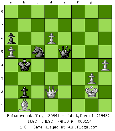 Last move : 1-0 2013 June 29 19:18:36 [Event "FICGS__CHESS__RAPID_A__000134"] [Site "FICGS"] [Date "2013.01.01"] [Round "1"] [White "Palamarchuk,Oleg"] [Black "Jabot,Daniel"] [Result "1-0"] [WhiteElo "2054"] [BlackElo "1948"] 1.d4 Nf6 2.c4 g6 3.Nf3 Bg7 4.Nc3 d6 5.e4 O-O 6.Be2 c5 7.d5 e6 8.O-O exd5 9.cxd5 Re8 10.Nd2 Na6 11.f3 Nc7 12.a4 b6 13.Nc4 Ba6 14.Bg5 Qd7 15.Qd2 Bxc4 16.Bxc4 a6 17.Bd3 b5 18.Rfe1 Reb8 19.Bc2 b4 20.Nd1 b3 21.Bd3 Rb4 22.a5 Nb5 23.Ne3 Qa7 24.Rac1 Nd7 25.f4 Re8 26.Nc4 Qb8 27.Kh1 Qb7 28.Re3 Bd4 29.Rh3 Nf6 30.Re1 Ng4 31.Rf1 Ra4 32.Bh4 Bg7 33.Rg3 Nf6 34.Bxf6 Bxf6 35.f5 Qe7 36.fxg6 hxg6 37.e5 Bxe5 38.Nxe5 dxe5 39.Bxg6 Rf4 40.Be4 Kf8 41.Rxf4 exf4 42.Qxf4 Qd6 43.Qh4 c4 44.Re3 Re5 45.Rf3 Ke8 46.h3 c3 47.bxc3 b2 48.c4 Nd4 49.Rf4 Qe7 50.Qh8+ Kd7 51.Bd3 Nb3 52.Qg8 f6 53.Kh2 Nc5 54.Bb1 Qd6 55.Qf7+ Re7 56.Qxf6 Re1 57.Qf5+ Kd8 58.g3 Nd7 59.Rf1 Rc1 60.Kg2 Qe7 61.Qg4 Kc7 62.Qf3 Qe5 63.Rd1 Rxd1 64.Qxd1 Kd6 65.Qd3 Kc5 66.h4 Kb4 67.d6 Qe1 68.Qc2 Qe5 69.c5 Nxc5 70.Qd2+ 1-0 King's Indian, 3.Nf3 Kingside Castling by player Black (move 5) Kingside Castling by player White (move 8) Player White won this chess game. Follow this game move after move (download)Could we look into the head of a Chess player, we should see there a whole world of feelings, images, ideas, emotion and passion. (Alfred Binet) Kombinieren und Schwarzhandel gehören verboten. (Savielly Grigorievitsch Tartakower) El tablero es el mundo, las piezas es el fenomeno del universo, las reglas del juego son lo que llamamos leyes de la naturaleza y el jugador del lado opuesto, se encuentra oculto a nuestra vista. (Thomas Huxley) Un millionnaire : 'Monsieur Steinitz ! Vous ne participez aux tournois que pour l'argent, alors que moi je n'y viens que pour l'honneur.' Steinitz : 'Chacun joue pour ce qu'il n'a pas'... Have no fear of perfection - you'll never reach it. (Salvador Dali)