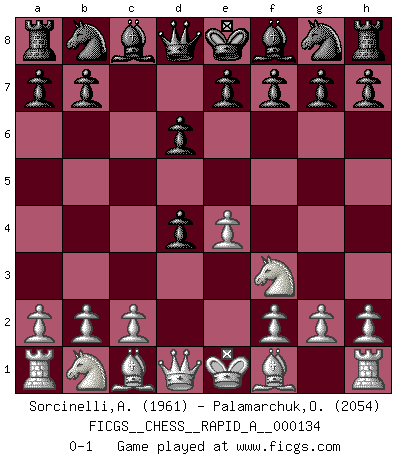 Last move : 0-1 2013 February 4 1:46:43 [Event "FICGS__CHESS__RAPID_A__000134"] [Site "FICGS"] [Date "2013.01.01"] [Round "1"] [White "Sorcinelli,Andrea"] [Black "Palamarchuk,Oleg"] [Result "0-1"] [WhiteElo "1961"] [BlackElo "2054"] 1.e4 c5 2.Nf3 d6 3.d4 cxd4 0-1 This chess game has been lost on time (started : 2013.01.01 22:29:16) Sicilian Player Black won this chess game. Follow this game move after move (download)Chess, like love, is infectious at any age. (Flohr) Dieses schreckliche Gefühl, dass ich gegen eine Maschine spielte, die niemals Fehler macht, zerschmetterte meinen Widerstand. (Mark Taimanov) El jugador blanco perdió porque fallo en recordar la coreccta continuación y tuvo que pensar por sí mismo las movidas. (Siegbert Tarrasch) La vérité est comme le meilleur coup aux échecs : elle existe, mais il faut la chercher. (Arturo Perez-Reverte) If everyone is thinking alike, then somebody isn't thinking. (US General George S. Patton)