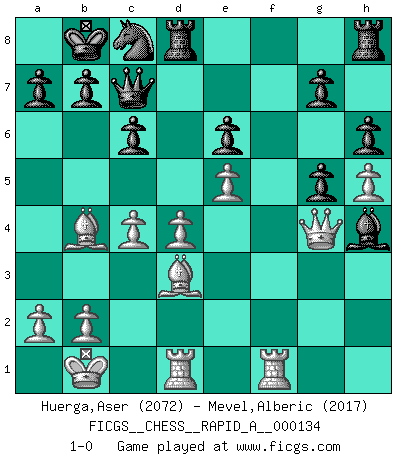 Last move : 1-0 2013 February 8 22:27:44 [Event "FICGS__CHESS__RAPID_A__000134"] [Site "FICGS"] [Date "2013.01.01"] [Round "1"] [White "Huerga,Aser"] [Black "Mevel,Alberic"] [Result "1-0"] [WhiteElo "2072"] [BlackElo "2017"] 1.e4 d5 2.exd5 Nf6 3.Nf3 Qxd5 4.Nc3 Qa5 5.d4 Bf5 6.Ne5 c6 7.Bf4 e6 8.g4 Bg6 9.h4 Bb4 10.Bd2 Qb6 11.h5 Be4 12.Nxe4 Nxe4 13.c3 Be7 14.Bc1 Nd6 15.Bd3 Qd8 16.Qe2 Nd7 17.f4 Qa5 18.Bd2 O-O-O 19.c4 Qc7 20.O-O-O Kb8 21.Kb1 Nxe5 22.fxe5 Nc8 23.Rhf1 Bh4 24.g5 h6 25.g6 fxg6 26.Qg4 g5 27.Bb4 1-0 Scandinavian defense Queenside Castling by player Black (move 18) Queenside Castling by player White (move 20) Player White won this chess game. Follow this game move after move (download)I prefer to lose a really good game than to win a bad one. (David Levy) Moralische Siege zählen nicht. (Savielly Grigorievitsch Tartakower) Desconfianza es la característica mas necesaria de un jugador de Ajedrez. (Siegbert Tarrasch) Les ravages du H expliquent la différence de niveau entre Tal et Thal [Abergel]. I take risks, sometimes patients die, but not taking risks causes more patients to die. So I guess my biggest problem is I've been cursed with the ability to do the math. (Gregory House, House M.D.)