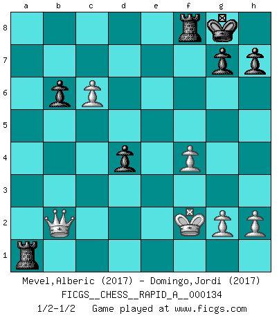 Last move : 1/2-1/2 2013 April 3 21:28:3 [Event "FICGS__CHESS__RAPID_A__000134"] [Site "FICGS"] [Date "2013.01.01"] [Round "1"] [White "Mevel,Alberic"] [Black "Domingo,Jordi"] [Result "1/2-1/2"] [WhiteElo "2017"] [BlackElo "2017"] 1.e4 e5 2.Bc4 Nf6 3.d4 exd4 4.Nf3 Nc6 5.e5 d5 6.Bb5 Ne4 7.Nxd4 Bc5 8.Be3 Bd7 9.Bxc6 bxc6 10.Nd2 Qh4 11.O-O Bb6 12.c3 O-O 13.f4 f6 14.exf6 Qxf6 15.Nxe4 Qe7 16.Qd2 Rae8 17.Nf3 Qxe4 18.Bxb6 cxb6 19.Ne5 Qf5 20.a4 Qe6 21.a5 c5 22.axb6 axb6 23.Ra7 Bc6 24.b4 Ra8 25.Rfa1 Qd6 26.Nxc6 Qxc6 27.b5 Rxa7 28.bxc6 Rxa1+ 29.Kf2 d4 30.cxd4 cxd4 31.Qb2 1/2-1/2 Bishop's Opening : Urusov gambit Kingside Castling by player White (move 11) Kingside Castling by player Black (move 12) This chess game ended in a draw. Follow this game move after move (download)Chess mastery essentially consists of analyzing Chess positions accurately. (Mikhail Botvinnik) Ich bin der einzige Schachspieler, der sich während der Vorbereitungen zum Turnier verletzt hat. (Woody Allen) No soy una persona materialista y por eso, no resiento la falta o pérdida del dinero. La ausencia de cosas mundanas carece de importancia. Ya que el Ajedrez es una forma en la que puedo ser tan materialista como yo desee sin tener la necesidad de vender mi alma. (Jamie Walter Adams) L'attaque fait le spectacle, la défense gagne les matchs. (Dicton footballistique) The faster the computer, the slower the brain. (Thibault de Vassal)