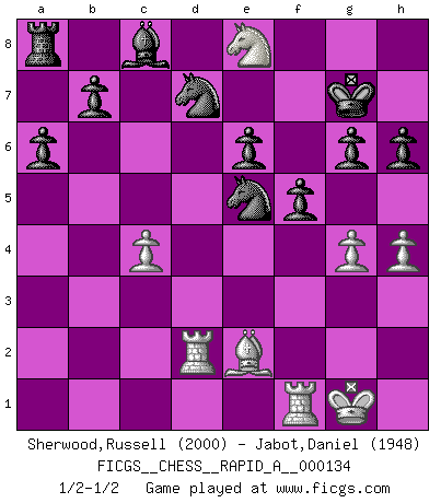 Last move : 1/2-1/2 2013 March 6 21:47:37 [Event "FICGS__CHESS__RAPID_A__000134"] [Site "FICGS"] [Date "2013.01.01"] [Round "1"] [White "Sherwood,Russell"] [Black "Jabot,Daniel"] [Result "1/2-1/2"] [WhiteElo "2000"] [BlackElo "1948"] 1.e4 c5 2.Nf3 d6 3.d4 cxd4 4.Nxd4 Nf6 5.Nc3 a6 6.Bg5 e6 7.f4 Qb6 8.Qd2 Qxb2 9.Rb1 Qa3 10.e5 dxe5 11.fxe5 Nfd7 12.Ne4 h6 13.Bh4 Qxa2 14.Rd1 Qd5 15.Qe3 Qxe5 16.Be2 Bc5 17.Bg3 Qd5 18.c4 Bxd4 19.Rxd4 Qa5+ 20.Rd2 O-O 21.Bd6 Rd8 22.Be7 Re8 23.Bh4 Rf8 24.Be7 Re8 25.Bh4 Rf8 26.O-O f5 27.Nd6 Qe5 28.Qxe5 Nxe5 29.Be7 Nbd7 30.Bxf8 Kxf8 31.g4 g6 32.h4 Kg7 33.Ne8+ Kf7 34.Nd6+ Kg7 35.Ne8+ 1/2-1/2 Sicilian : Najdorf, 7...Qb6 Kingside Castling by player Black (move 20) Kingside Castling by player White (move 26) This chess game ended in a draw. Follow this game move after move (download)Bobby is the most misunderstood, misquoted celebrity walking the face of this earth. (Yasser Seirawan) Am wohlsten fühle ich mich, wenn ich sehe, wie sich mein Gegner im Todeskampf windet. (Robert James Fischer) Jugadores de primera clase pierden en contra de jugadores de segunda clase porque los jugadores de segunda clase a veces juegan una partida de primer clase. (Siegbert Tarrasch) On est toujours la mazette de quelqu'un d'autre. (Anonyme) Crush them ! Make them suffer ! (General Grievous in Star Wars ep.3)