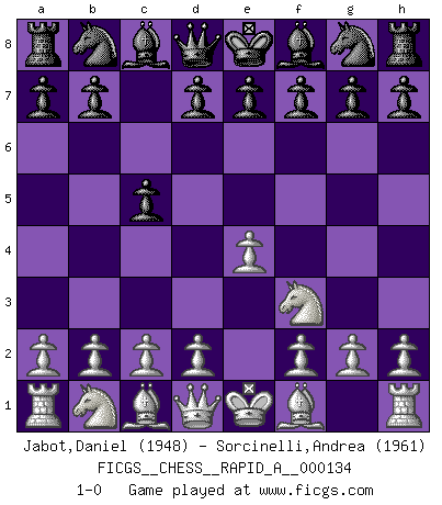 Last move : 1-0 2013 February 3 1:42:3 [Event "FICGS__CHESS__RAPID_A__000134"] [Site "FICGS"] [Date "2013.01.01"] [Round "1"] [White "Jabot,Daniel"] [Black "Sorcinelli,Andrea"] [Result "1-0"] [WhiteElo "1948"] [BlackElo "1961"] 1.e4 c5 2.Nf3 1-0 This chess game has been lost on time (started : 2013.01.01 22:29:16) Sicilian defense Player White won this chess game. Follow this game move after move (download)A sacrifice is best refuted by accepting it. (Wilhelm Steinitz) Wenn Dein Gegner dir ein Remis anbietet, versuch herauszufinden, weshalb er glaubt schlechter zu stehen. (Nigel Short) Al jugar al Ajedrez entonces, podemos aprender: Primero: Previsión... Segundo: Prudencia... Tercero: Cautela... Y al final, aprendemos del Ajedrez el hábito de no ser desanimados por apariencias malas presentes en el estado de nuestros asuntos, el hábito de la esperanza por una oportunidad favorable y la perseveración de los secretos de los recursos. (Benjamin Franklin) Le temps de noter son nom sur la feuille de partie, j'étais déjà en zeitnot ! D'un modeste amateur apparié lors de la première ronde d'un open contre le grand-maître Azmaïparashvili. A computer lets you make more mistakes faster than any invention in human history - with the possible exceptions of handguns and tequila. (Mitch Ratcliffe)