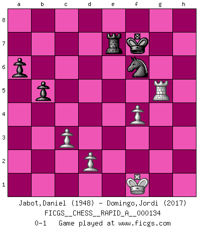 Last move : 0-1 2013 May 9 21:8:39 [Event "FICGS__CHESS__RAPID_A__000134"] [Site "FICGS"] [Date "2013.01.01"] [Round "1"] [White "Jabot,Daniel"] [Black "Domingo,Jordi"] [Result "0-1"] [WhiteElo "1948"] [BlackElo "2017"] 1.e4 e5 2.Nf3 f5 3.exf5 e4 4.Nd4 Qf6 5.Qh5+ g6 6.fxg6 hxg6 7.Qd5 Ne7 8.Qc4 d5 9.Qc3 Bg7 10.Nb5 Qf7 11.Nxc7+ Kd8 12.Qc5 Nd7 13.Qd6 Be5 14.Qe6 Qg7 15.Nxd5 Nxd5 16.Qxd5 Bxb2 17.Qg5+ Ke8 18.Bxb2 Qxb2 19.Qxg6+ Kd8 20.Qg5+ Nf6 21.c3 Qc1+ 22.Ke2 Rf8 23.f3 Bd7 24.Kf2 Rc8 25.h3 Qb2 26.Qa5+ Ke8 27.Qe5+ Kf7 28.Na3 Qxa3 29.Rb1 Qxa2 30.Qd4 b5 31.Be2 exf3 32.gxf3 Rfe8 33.Rhg1 a6 34.Ra1 Qe6 35.Bd3 Rg8 36.Rxg8 Kxg8 37.Re1 Qc6 38.Re5 Kf7 39.h4 Re8 40.Rg5 Rg8 41.Qf4 Qb6+ 42.Ke2 Ke7 43.Qb4+ Ke8 44.f4 Bg4+ 45.Kf1 Kf7 46.Bc2 Be6 47.Bb3 Qc6 48.Bxe6+ Qxe6 49.Qd4 Rh8 50.Qa7+ Nd7 51.Qd4 Rxh4 52.Kf2 Rh2+ 53.Kg1 Re2 54.Kf1 Nf6 55.Qa7+ Qe7 56.Qxe7+ Rxe7 0-1 Latvian counter-gambit 10 pieces endgame at move 56 : White KRPPP , Black KRNPP WHITE : King + 1 Rook 3 Pawns BLACK : King + 1 Rook 1 Knight 2 Pawns Player Black won this chess game. Follow this game move after move (download)Examine moves that smite! A good eye for smites is far more important than a knowledge of strategical principles. (Purdy) Warum muß ich gegen diesen IDIOTEN verlieren? (Aaron Nimzowitsch) Si tu oponente te ofrece un empate, trata de averiguar porque piensa él que esta en una posición peor. (Nigel Short) Les échecs, c'est l'art d'analyser. (Mikhail Botvinnik) Every man's memory is his private literature. (Aldous Huxley)