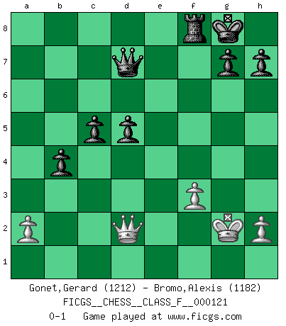 Last move : 0-1 2013 January 3 21:36:39 [Event "FICGS__CHESS__CLASS_F__000121"] [Site "FICGS"] [Date "2013.01.02"] [Round "1"] [White "Gonet,Gerard"] [Black "Bromo,Alexis"] [Result "0-1"] [WhiteElo "1212"] [BlackElo "1182"] 1.d4 d5 2.e4 c6 3.e5 e6 4.Nf3 Bb4+ 5.c3 Ba5 6.Bd3 Nd7 7.b4 Bb6 8.O-O f6 9.Re1 Ne7 10.exf6 Nxf6 11.Ng5 Qd6 12.Qe2 Bc7 13.g3 O-O 14.Bf4 Qd7 15.Nxe6 Bxf4 16.gxf4 Re8 17.Nd2 Ng6 18.f5 Nf4 19.Qe3 Nxd3 20.Qxd3 b6 21.Nf3 Ne4 22.Ne5 Qd6 23.c4 Bxe6 24.c5 Qc7 25.fxe6 Rxe6 26.f3 Ng5 27.Re2 Rf8 28.Rg2 Rxe5 29.dxe5 Qxe5 30.Rf1 Nh3+ 31.Kh1 Nf4 32.Qd2 Nxg2 33.Kxg2 bxc5 34.Re1 Qf5 35.Re7 cxb4 36.Rxa7 c5 37.Rd7 Qxd7 0-1 Blackmar gambit Kingside Castling by player White (move 8) Kingside Castling by player Black (move 13) Player Black won this chess game. Follow this game move after move (download)Winning isn't everything... but losing is nothing. (Mednis) Die Neutralität betrachte ich als eine schwere Krankheit. (Viktor Kortschnoi) La única cosa que los jugadores de Ajedrez tienen en común, es el Ajedrez. (Lodewijk Prins) Mais l'homme est une créature légère et illogique : semblable au joueur d'échecs, il n'aime que le processus du but à atteindre, non le but lui-même. (Dostoïevsky) It is not titles that honor men, but men that honor titles. (Niccolo Machiavelli)
