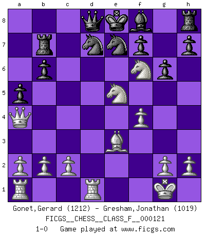 Last move : 1-0 2013 January 13 19:14:19 [Event "FICGS__CHESS__CLASS_F__000121"] [Site "FICGS"] [Date "2013.01.02"] [Round "1"] [White "Gonet,Gerard"] [Black "Gresham,Jonathan"] [Result "1-0"] [WhiteElo "1212"] [BlackElo "1019"] 1.d4 d5 2.e4 e5 3.Nc3 Nc6 4.Be3 Nf6 5.dxe5 Nxe5 6.f4 Nc6 7.exd5 Ne7 8.Bc4 b6 9.Nf3 Bb7 10.d6 cxd6 11.O-O d5 12.Bb5+ Bc6 13.Qd3 Bxb5 14.Qxb5+ Nd7 15.Nxd5 a6 16.Qb3 Rb8 17.Rfd1 Rb7 18.Ne5 g6 19.Qa4 a5 20.Nf6+ 1-0 Blackmar gambit Kingside Castling by player White (move 11) Player White won this chess game. Follow this game move after move (download)In life, as in Chess, one's own Pawns block one's way. A man's very wealth, ease, leisure, children, books, which should help him to win, more often checkmate him. (Charles Buxton) Ich habe Putins Aufstieg an die Macht beobachtet und seine Politik, die demokratischen Institutionen meines Landes zu zerstören. (Garry Kasparov) De eso se trata el Ajedrez. Un día le das una lección a tu oponente y al día siguiente el te da una a tí. (Bobby Fischer) Je menace de comprendre la position. (Anonyme) Do you know these so called Volunteers don't even get paid! (Simpsons)