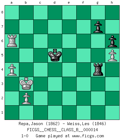 Last move : 1-0 2007 June 18 4:7:1 [Event "FICGS__CHESS__CLASS_B__000014"] [Site "FICGS"] [Date "2007.01.23"] [Round "1"] [White "Repa,Jason"] [Black "Weiss,Les"] [Result "1-0"] [WhiteElo "1862"] [BlackElo "1846"] 1.e4 c5 2.Nf3 d6 3.d4 cxd4 4.Qxd4 Nc6 5.Bb5 Bd7 6.Bxc6 Bxc6 7.Nc3 Nf6 8.Bg5 e6 9.O-O-O Be7 10.Qd3 O-O 11.Nd4 Rc8 12.f4 Qa5 13.h4 Rfe8 14.Kb1 Ng4 15.Bxe7 Rxe7 16.Qd2 Qh5 17.g3 Rd7 18.Qe2 Nf6 19.Qxh5 Nxh5 20.Rd3 Nf6 21.Re1 a6 22.a4 d5 23.Nxc6 bxc6 24.e5 Ng4 25.Ne4 c5 26.c4 h6 27.cxd5 c4 28.Rc3 exd5 29.Nd6 Rc6 30.Rd1 f6 31.Rxd5 fxe5 32.fxe5 Nxe5 33.Rxe5 R7xd6 34.Re4 Rd1+ 35.Ka2 Rg1 36.g4 Kf7 37.h5 Kf6 38.Rexc4 Rxc4 39.Rxc4 Ke5 40.Rc6 Rxg4 41.Rxa6 Kd5 42.Kb3 1-0 Sicilian, Chekhover variation Queenside Castling by player White (move 9) Kingside Castling by player Black (move 10) 10 pieces endgame at move 40 : White KRPPP , Black KRPPP WHITE : King + 1 Rook 3 Pawns BLACK : King + 1 Rook 3 Pawns 9 pieces endgame at move 41 : White KRPPP , Black KRPP WHITE : King + 1 Rook 3 Pawns BLACK : King + 1 Rook 2 Pawns Player White won this chess game. Follow this game move after move (download)In Chess, at least, the brave inherit the earth. (Edmar Mednis) Man gibt nur Pakete auf. (Paul Keres) No es una movida, aún la mejor movida que tu debas buscar, sino un plan comprensible. (Eugene Znosko-Borovsky) Le génie consiste à savoir transgresser les règles au moment opportun. (Teichmann) Waiting for chance ? Play in casinos. (FICGS proverb)