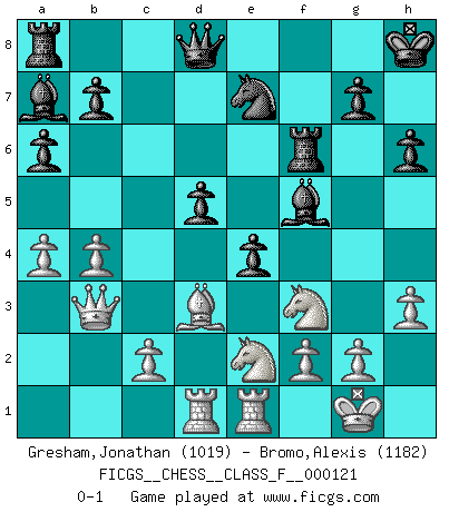 Last move : 0-1 2013 January 15 20:29:27 [Event "FICGS__CHESS__CLASS_F__000121"] [Site "FICGS"] [Date "2013.01.02"] [Round "1"] [White "Gresham,Jonathan"] [Black "Bromo,Alexis"] [Result "0-1"] [WhiteElo "1019"] [BlackElo "1182"] 1.e4 e5 2.Nf3 Nc6 3.Bc4 h6 4.O-O Nf6 5.Nc3 Bb4 6.a3 Ba5 7.d4 d6 8.Re1 O-O 9.h3 Re8 10.Bb5 Bd7 11.d5 Ne7 12.b4 Bb6 13.a4 a6 14.Bc4 Ba7 15.Bb2 c6 16.dxc6 Nxc6 17.Ne2 Nxe4 18.Qd5 Nf6 19.Qxf7+ Kh8 20.Rad1 Rf8 21.Qg6 Ne7 22.Qd3 Bf5 23.Qb3 d5 24.Bd3 e4 25.Bxf6 Rxf6 0-1 King's pawn game Kingside Castling by player White (move 4) Kingside Castling by player Black (move 8) Player Black won this chess game. Follow this game move after move (download)Avoid the crowd. Do your own thinking independently. Be the Chess player, not the Chess piece. (Ralph Charell) Ein guter Spieler hat immer Glück. (José Raúl Capablanca) No es suficiente ser un buen jugador, se debe también de jugar bién. (Siegbert Tarrasch) Le plus grand jeu de l'esprit jamais inventé, plus vous l'apprenez, plus vous y prenez du plaisir. (Garry Kasparov) Shallow men believe in luck. Strong men belive in cause and effect. (Ralph Waldo Emerson)