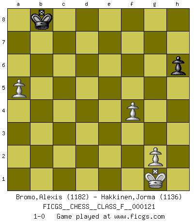 Last move : 1-0 2013 January 8 21:38:17 [Event "FICGS__CHESS__CLASS_F__000121"] [Site "FICGS"] [Date "2013.01.02"] [Round "1"] [White "Bromo,Alexis"] [Black "Hakkinen,Jorma"] [Result "1-0"] [WhiteElo "1182"] [BlackElo "1136"] 1.d4 d5 2.c4 c6 3.Nc3 Nf6 4.Nf3 g6 5.Bg5 Bg7 6.e3 O-O 7.c5 Bg4 8.Be2 Nbd7 9.h3 Bxf3 10.Bxf3 Re8 11.b4 e5 12.O-O exd4 13.exd4 h6 14.Bh4 g5 15.Bg3 a5 16.a3 Nh7 17.b5 cxb5 18.Nxb5 Ndf6 19.Nc7 Rc8 20.Nxe8 Nxe8 21.Re1 Kf8 22.Rb1 f5 23.Bd6+ Nxd6 24.cxd6 Qxd6 25.Rb5 g4 26.hxg4 fxg4 27.Bxg4 Rc7 28.Qf3+ Rf7 29.Qxd5 Qxd5 30.Rxd5 Kg8 31.Be6 Nf6 32.Bxf7+ Kxf7 33.Rxa5 Kg6 34.d5 Ng4 35.d6 Bf6 36.Re6 Kf7 37.Rxf6+ Nxf6 38.Rf5 Ke6 39.Rb5 Kxd6 40.Rb6+ Ke7 41.Rxb7+ Kd8 42.a4 Kc8 43.Rb3 Nd7 44.a5 Nb8 45.Rxb8+ Kxb8 46.f4 1-0 QGD Slav defense Kingside Castling by player Black (move 6) Kingside Castling by player White (move 12) 10 pieces endgame at move 37 : White KRPPPP , Black KNPP WHITE : King + 1 Rook 4 Pawns BLACK : King + 1 Knight 2 Pawns 9 pieces endgame at move 39 : White KRPPP , Black KNPP WHITE : King + 1 Rook 3 Pawns BLACK : King + 1 Knight 2 Pawns 8 pieces endgame at move 41 : White KRPPP , Black KNP WHITE : King + 1 Rook 3 Pawns BLACK : King + 1 Knight 1 Pawn 7 pieces endgame at move 45 : White KRPPP , Black KP WHITE : King + 1 Rook 3 Pawns BLACK : King + 1 Pawn 6 pieces endgame at move 45 : White KPPP , Black KP WHITE : King + 3 Pawns BLACK : King + 1 Pawn Player White won this chess game. Follow this game move after move (download)If Chess is a science, it's a most inexact one. If Chess is an art, it is too exacting to be seen as one. If Chess is a sport, it's too esoteric. If Chess is a game, it's too demanding to be just a game. If Chess is a mistress, she's a demanding one. If Chess is a passion, it's a rewarding one. If Chess is life, it's a sad one. (Unknown) Wer wird heute Abend ihr Gegner sein? -- Heute Abend spiele ich gegen die schwarzen Steine. (Akiba Rubinstein) El jugador táctico sabe que hacer cuando hay algo que hacer; mientras que el estratega sabe que hacer cuando no hay nada que hacer. (Gerald Abrahams) Les réformistes prétendent que les progrès de la théorie conduiront à la disparition des échecs, et qu'il faut, pour leur rendre vie, en remanier les règles. En réalité, qu'exprime cette affirmation? Le mépris de l'intuition, de l'imagination et de tous les autres éléments qui font des échecs un art. (Alexander Alekhine) I find television to be very educating. Every time somebody turns on the set, I go in the other room and read a book. (Groucho Marx)