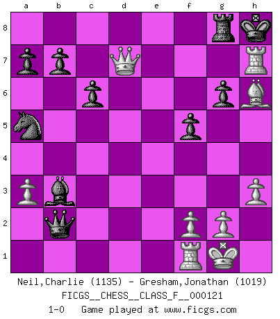 Last move : 1-0 2013 April 4 19:8:51 [Event "FICGS__CHESS__CLASS_F__000121"] [Site "FICGS"] [Date "2013.01.02"] [Round "1"] [White "Neil,Charlie"] [Black "Gresham,Jonathan"] [Result "1-0"] [WhiteElo "1135"] [BlackElo "1019"] 1.d4 Nf6 2.c4 g6 3.Nc3 d5 4.cxd5 Nxd5 5.e4 Nb6 6.Be3 Bg7 7.Be2 O-O 8.Nf3 Bg4 9.h3 Bd7 10.O-O Be8 11.e5 Nc6 12.a3 e6 13.Ne4 f5 14.Nc5 Qb8 15.Nxe6 Rf7 16.Nxg7 Rxg7 17.Bh6 Re7 18.Qb3+ Kh8 19.Rac1 Bf7 20.d5 Nxd5 21.Bc4 Na5 22.Qd1 c6 23.Ba2 Nc3 24.Rxc3 Bxa2 25.b3 Rxe5 26.Nxe5 Qxe5 27.Re3 Qb2 28.Qd7 Bxb3 29.Re7 Rg8 30.Rxh7+ 1-0 King's Indian defense, 3.Nc3 Kingside Castling by player Black (move 7) Kingside Castling by player White (move 10) Player White won this chess game. Follow this game move after move (download)The blunders are all there on the board, waiting to be made. (Savielly Tartakover) Schach ist die gewalttätigste aller Sportarten. (Garry Kasparov) El Ajedrez te enseña a controlarl la excitación inicial que sientes cuando vez algo que parece bueno y te enseña a pensar objetivamente cuando te encuentras en problemas. (Stanley Kubrick) Le profane ne songe pas à la somme de jouissance dont il se prive, qui méconnaît ce jeu aux ressources aussi variées que passionnantes. (Jean-Marie Jeanton-Lamarche) He who is a good ruler must first have been ruled. (Aristotle)