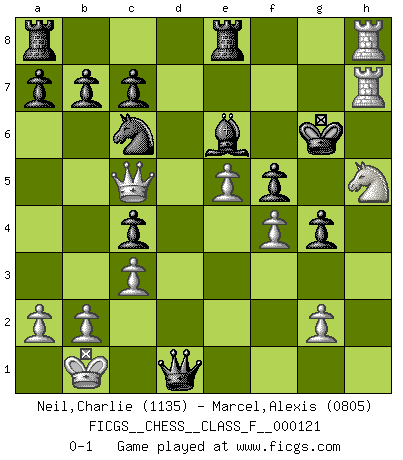 Last move : 0-1 2013 February 3 23:44:38 [Event "FICGS__CHESS__CLASS_F__000121"] [Site "FICGS"] [Date "2013.01.02"] [Round "1"] [White "Neil,Charlie"] [Black "Marcel,Alexis"] [Result "0-1"] [WhiteElo "1135"] [BlackElo "0805"] 1.d4 f5 2.Bg5 Nf6 3.Bxf6 exf6 4.Nc3 g6 5.e4 fxe4 6.Nxe4 Bg7 7.Bc4 f5 8.Ng3 d5 9.Qe2+ Kf7 10.O-O-O dxc4 11.Nf3 Re8 12.Ne5+ Bxe5 13.dxe5 Qg5+ 14.Kb1 Be6 15.h4 Qe7 16.h5 Kg7 17.hxg6 hxg6 18.Qe3 g5 19.f4 g4 20.Rh5 Nc6 21.Rdh1 Qb4 22.Rh7+ Kf8 23.c3 Qa4 24.Qc5+ Kg8 25.Rh8+ Kg7 26.R1h7+ Kg6 27.Nh5 Qd1+ 0-1 Dutch, 2.Bg5 variation Queenside Castling by player White (move 10) Player Black won this chess game. Follow this game move after move (download)In blitz, the Knight is stronger than the Bishop. (Vlastimil Hort) Ich rechne überhaupt nicht voraus. Ich gewinne auch so. (Robert James Fischer) Por la belleza de sus partidas, la claridad de su juego y lo brillante de sus ideas, Fischer se creó el mismo como un artista de la misma estatura como Brahms, Rembrandt y Shakespeare. (David Levy) Le système Elo représente seulement une moyenne. Il est simplement un indicateur de votre stabilité. (Anatoli Karpov) Nothing is more important for teaching us to understand the concepts we have than constructing fictitious ones. (Ludwig Wittgenstein)