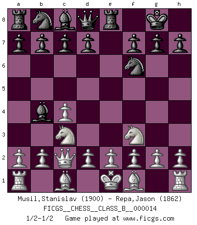 Last move : 1/2-1/2 2007 January 25 6:56:47 [Event "FICGS__CHESS__CLASS_B__000014"] [Site "FICGS"] [Date "2007.01.23"] [Round "1"] [White "Musil,Stanislav"] [Black "Repa,Jason"] [Result "1/2-1/2"] [WhiteElo "1900"] [BlackElo "1862"] 1.c4 e5 2.Nf3 Nf6 3.Nc3 Bb4 4.Nxe5 O-O 5.Qc2 Re8 6.Nf3 1/2-1/2 English, Nimzovich variation Kingside Castling by player Black (move 4) This chess game ended in a draw. Follow this game move after move (download)Fischer was a master of clarity and a king of artful positioning. His opponents would see where he was going but were powerless to stop him. (Bruce Pandolfini) Ihnen, Herr Lasker, habe ich nur drei Worte zu sagen: Schach und matt. (Siegbert Tarrasch) Coloca el contenido del tablero de Ajedrez en un sombrero, agita las piezas vigorosamente, derrámalas en el tablero desde una altura de medio metro y así obtienes el estilo de Wilhelm Steinitz. (H. E. Bird) Les Cavaliers se révèlent fort utiles dans les positions fermées. D'habitude, les Fous sont un peu plus forts que les Cavaliers dans les positions ouvertes. Qu'on le veuille ou non, il restera toujours des exceptions ! No, no, you're not thinking; you're just being logical. (Niels Bohr)