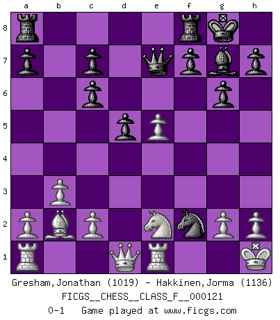 Last move : 0-1 2013 January 15 21:21:23 [Event "FICGS__CHESS__CLASS_F__000121"] [Site "FICGS"] [Date "2013.01.02"] [Round "1"] [White "Gresham,Jonathan"] [Black "Hakkinen,Jorma"] [Result "0-1"] [WhiteElo "1019"] [BlackElo "1136"] 1.e4 e5 2.b3 Nc6 3.Bb2 Nf6 4.Nf3 d6 5.Bb5 Bd7 6.Nc3 g6 7.O-O Bg7 8.d4 exd4 9.Bxc6 Bxc6 10.Nxd4 O-O 11.Re1 d5 12.e5 Ne4 13.Nce2 Qe7 14.Nxc6 bxc6 15.Kh1 Nxf2+ 0-1 King's pawn game Kingside Castling by player White (move 7) Kingside Castling by player Black (move 10) Player Black won this chess game. Follow this game move after move (download)The Pin is mightier than the sword. (Fred Reinfeld) Viele Opfer benötigen überhaupt keine konkrete Berechnung. Es genügt sich die entstehende Position kurz vorzustellen, um uns davon zu überzeugen, dass das Opfer korrekt ist. (Mikhail Nekhemyevich Tal) Juega la Apertura como un libro, el Juego Medio como un mago y los Finales como una máquina. (Spielmann) Toute estimation doit être constamment réévaluée. (Jacob Estrin) Tree pose grows confidence. It roots me to this world. (Terri Guillemets)