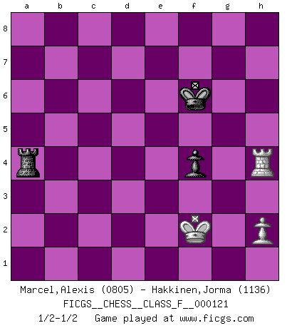 Last move : 1/2-1/2 2013 February 4 12:19:13 [Event "FICGS__CHESS__CLASS_F__000121"] [Site "FICGS"] [Date "2013.01.02"] [Round "1"] [White "Marcel,Alexis"] [Black "Hakkinen,Jorma"] [Result "1/2-1/2"] [WhiteElo "0805"] [BlackElo "1136"] 1.f4 d5 2.Nf3 c6 3.e3 Nf6 4.b3 g6 5.Bb2 Bg7 6.Be2 O-O 7.O-O Bg4 8.Qe1 Nbd7 9.Ne5 Bxe2 10.Qxe2 Nxe5 11.Bxe5 Qb6 12.Nc3 Ne4 13.Nxe4 dxe4 14.Bxg7 Kxg7 15.a4 f5 16.Qc4 Rad8 17.Qc3+ Kh6 18.Rad1 c5 19.d3 exd3 20.Rxd3 Rxd3 21.cxd3 a5 22.Rc1 Qd6 23.Rd1 Re8 24.Qxa5 b6 25.Qc3 e5 26.fxe5 Rxe5 27.d4 cxd4 28.exd4 Re4 29.Qh3+ Kg7 30.d5 h5 31.Qc3+ Kf7 32.g3 Re5 33.Qc6 Qxc6 34.dxc6 Rc5 35.Rd6 g5 36.c7 Rxc7 37.Rxb6 Rc1+ 38.Kf2 Rc2+ 39.Kg1 Rb2 40.b4 f4 41.gxf4 gxf4 42.Rh6 Rxb4 43.Rxh5 Rxa4 44.Rh4 Kf6 45.Kf2 1/2-1/2 Bird's Opening Kingside Castling by player Black (move 6) Kingside Castling by player White (move 7) 10 pieces endgame at move 41 : White KRPPPP , Black KRPP WHITE : King + 1 Rook 4 Pawns BLACK : King + 1 Rook 2 Pawns 9 pieces endgame at move 41 : White KRPPP , Black KRPP WHITE : King + 1 Rook 3 Pawns BLACK : King + 1 Rook 2 Pawns 8 pieces endgame at move 42 : White KRPP , Black KRPP WHITE : King + 1 Rook 2 Pawns BLACK : King + 1 Rook 2 Pawns 7 pieces endgame at move 43 : White KRPP , Black KRP WHITE : King + 1 Rook 2 Pawns BLACK : King + 1 Rook 1 Pawn 6 pieces endgame at move 43 : White KRP , Black KRP WHITE : King + 1 Rook 1 Pawn BLACK : King + 1 Rook 1 Pawn This chess game ended in a draw. Follow this game move after move (download)Pawn endings are to Chess what putting is to golf. (Cecil Purdy) Fischer: 'Remis!?' Uhlmann: 'Aber es muss doch dreimal Zugwiederholung sein!' Fischer: 'Sie nehmen das Remis an, wie ich es sage, sonst spiele ich weiter und werde Sie dann schlagen!' (Robert James Fischer) Bobby es el jugador de Ajedrez mas fino que este país jamás haya producido. Su memoria para las movidas, su brillantez en soñar combinaciones y su feróz determinación por la victoria son algo extraño. (John Collins) Des combinaisons [dans le jeu d'échecs] pareilles à des mélodies. Je crois entendre pour ainsi dire la musique des coups... (Vladimir Nabokov) It is not true that people stop pursuing dreams because they grow old, they grow old because they stop pursuing dreams. (Gabriel Garcia Marquez)