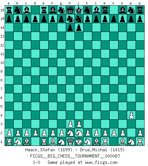 Last move : 1-0 2013 February 6 1:50:22 [Event "FICGS__BIG_CHESS__TOURNAMENT__000087"] [Site "FICGS"] [Date "2013.01.03"] [Round "1"] [White "Haack,Stefan"] [Black "Drus,Michal"] [Result "1-0"] [WhiteElo "1699"] [BlackElo "1419"] 1.p2-p4 1-0 This big chess game has been lost on time (started : 2013.01.03 23:7:28) Follow this game move after move (download)My opponents make good moves too. Sometimes I don't take these things into consideration. (Bobby Fischer) Gewöhnliche Menschen denken nur daran, wie sie ihre Zeit verbringen. Ein intelligenter Mensch versucht, sie auszunutzen. (Arthur Schopenhauer) Un sacrificio se refuta mucho mejor al aceptarlo. (Wilhelm Steinitz) Avec des compensations pour le matériel en plus... (Anonyme) Kids, you tried your best and you failed miserably. The lesson is, never try. (Simpsons)