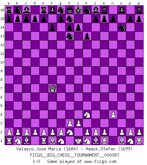 Last move : 1-0 2013 February 10 2:17:26 [Event "FICGS__BIG_CHESS__TOURNAMENT__000087"] [Site "FICGS"] [Date "2013.01.03"] [Round "1"] [White "Velasco,Jose Maria"] [Black "Haack,Stefan"] [Result "1-0"] [WhiteElo "1684"] [BlackElo "1699"] 1.j2-k4 k15-k13 2.h1-o7 j15-h13 3.o7-o15 p16-o14 4.o15-f7 f15-f14 5.n2-n4 1-0 This big chess game has been lost on time (started : 2013.01.03 23:7:28) Follow this game move after move (download)Chess is a terrific way for kids to build self image and self esteem. (Saudin Robovic) Ohne Leiden bildet sich kein Charakter. (Ernst Freiherr von Feuchtersleben) A la fecha, Fischer esta simplemente un nivel arriba de todos los mejores jugadores de Ajedrez del mundo. (John Jacobs) Demandez au pauvre Cg1 ce qu'il en pense. Eduard Gufeld à propos de la variante Saemisch de l'Est-Indienne. Life is painting a picture, not doing a sum. (Oliver Wendell Holmes, Jr.)