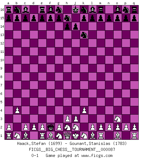 Last move : 0-1 2013 February 7 14:1:22 [Event "FICGS__BIG_CHESS__TOURNAMENT__000087"] [Site "FICGS"] [Date "2013.01.03"] [Round "1"] [White "Haack,Stefan"] [Black "Gounant,Stanislas"] [Result "0-1"] [WhiteElo "1699"] [BlackElo "1783"] 1.b2-b4 j15-k13 2.k2-k4 h16-o10 3.p1-o3 o10-f2 0-1 This big chess game has been lost on time (started : 2013.01.03 23:7:28) Follow this game move after move (download)The most important feature of the Chess position is the activity of the pieces. This is absolutely fundamental in all phases of the game: Opening, Middlegame and especially Endgame. The primary constraint on a piece's activity is the Pawn structure. (Michael Stean) Rubinstein ist ein Turmendspiel, welches die Götter vor tausenden von Jahren begannen. (Savielly Grigorievitsch Tartakower) No hay un Gran Maestro de Ajedrez que sea normal; solo se diferencían ellos por la magnitud de su locura. (Viktor Korchnoi) Il vaut toujours mieux jouer un plan faux de façon logique que de n'avoir pas de plan du tout. (Victor Kortchnoï) The real danger is not that computers will begin to think like men, but that men will begin to think like computers. (Sydney J. Harris)