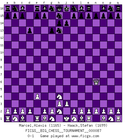 Last move : 0-1 2013 March 25 1:47:6 [Event "FICGS__BIG_CHESS__TOURNAMENT__000087"] [Site "FICGS"] [Date "2013.01.03"] [Round "1"] [White "Marcel,Alexis"] [Black "Haack,Stefan"] [Result "0-1"] [WhiteElo "1165"] [BlackElo "1699"] 1.e2-e4 g15-g13 2.j2-h4 j15-h13 3.h1-n6 d15-d13 0-1 Follow this game move after move (download)If one piece is badly posted, the whole game is bad. (Tarrasch) Frage: Gibt es etwas was Sie mehr lieben als Autobahnen ohne Tempobegrenzungen? - Antwort: Deutsche Frauen ohne Tempobegrenzungen. (Loek van Wely) Después de una mala apertura, hay una esperanza en el juego medio. Pero una vez que estas en finales, el momento de la verdad ha llegado. (Edmar Mednis) Les Echecs sont et restent toujours un combat, un combat intégral comme la boxe, la lutte ou un autre sport, et où il doit y avoir un vainqueur et un vaincu. (Joseph Emil Diemer) May I never be complete. May I never be content. May I never be perfect. Deliver me, Tyler, from being perfect and complete. (Chuck Palahniuk, Fight Club)