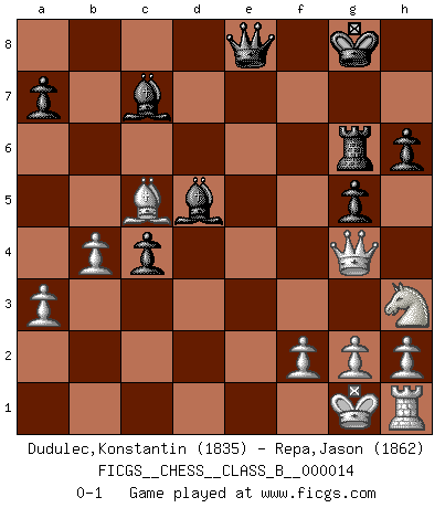 Last move : 0-1 2007 July 17 20:54:33 [Event "FICGS__CHESS__CLASS_B__000014"] [Site "FICGS"] [Date "2007.01.23"] [Round "1"] [White "Dudulec,Konstantin"] [Black "Repa,Jason"] [Result "0-1"] [WhiteElo "1835"] [BlackElo "1862"] 1.d4 e6 2.c4 b6 3.e4 Bb7 4.Bd3 f5 5.exf5 Bb4+ 6.Kf1 Nf6 7.c5 bxc5 8.a3 c4 9.Bxc4 Ba5 10.fxe6 dxe6 11.Bxe6 Nc6 12.Ne2 Bb6 13.d5 Ne7 14.Qa4+ Kf8 15.Nbc3 Nexd5 16.Nxd5 Nxd5 17.Bd2 Qf6 18.Nf4 g5 19.Bxd5 Bxd5 20.Bc3 Qf7 21.Nh3 Rg8 22.Qb4+ c5 23.Qg4 h6 24.Re1 Bc7 25.Kg1 Rd8 26.Bd2 Rg6 27.Be3 Re8 28.b4 c4 29.Bc5+ Kg8 30.Rxe8+ Qxe8 0-1 Queen's pawn : Keres defense Player Black won this chess game. Follow this game move after move (download)Openings teach you openings. Endgames teach you chess ! (Stephan Gerzadowicz) Matt entspricht nicht immer den Tatsachen. (Savielly Grigorievitsch Tartakower) Cada Peón es potencialmente una Reina. (James Mason) Même si l'adversaire joue le coup analysé précédemment, recommencez l'analyse en voyant la nouvelle position. Première règle de Blumenfeld Sometimes it pays to stay in bed in Monday, rather than spending the rest of the week debugging Monday's code. (Dan Salomon)