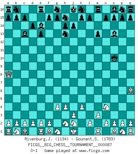 Last move : 0-1 2013 February 13 14:45:18 [Event "FICGS__BIG_CHESS__TOURNAMENT__000087"] [Site "FICGS"] [Date "2013.01.03"] [Round "1"] [White "Rivenburg,John"] [Black "Gounant,Stanislas"] [Result "0-1"] [WhiteElo "1134"] [BlackElo "1783"] 1.k2-k4 j15-h13 2.g2-g4 h16-o10 3.h1-a8 e15-e13 4.h3-h4 f16-c13 5.m2-m3 d15-d14 6.l1-q6 c16-e14 7.k1-l3 m15-m13 8.l3-n4 l16-o13 0-1 This big chess game has been lost on time (started : 2013.01.03 23:7:28) Follow this game move after move (download)No other master has such a terrific will to win. At the board he radiates danger, and even the strongest opponents tend to freeze, like rabbits when they smell a panther. Even his weaknesses are dangerous. As white, his opening game is predictable - you can make plans against it - but so strong that your plans almost never work. In the middle game his precision and invention are fabulous, and in the end game you simply cannot beat him. (Anonymous German Expert) Frage des Reporters: -Worin besteht das Ziel von Gambiteröffnungen? Antwort: -Auf Kosten der Partie einen Ruf als Angriffspieler zu erwerben.- (Siegbert Tarrasch) Después de la respuesta de las negras a 1.e4 con 1..e5, se quedan siempre tratando de entrar dentro del juego. (Howard Staunton) Vous savez, camarade Pachman, je n'éprouve pas de plaisir à être ministre, je jouerais plutôt aux échecs comme vous, ou alors ferais une révolution au Venezuela. (Che Guevara à Ludek Pachman, 'Checkmate in Prague', 1975) Creativity is allowing yourself to make mistakes. Art is knowing which ones to keep. (Scott Adams)