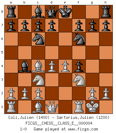 Last move : 1-0 2006 August 2 3:25:5 [Event "FICGS__CHESS__CLASS_E__000004"] [Site "FICGS"] [Date "2006.05.16"] [Round "1"] [White "Coll,Julien"] [Black "Sartorius,Julien"] [Result "1-0"] [WhiteElo "1400"] [BlackElo "1200"] 1.e4 e5 2.Nc3 Nc6 3.f4 exf4 4.Nf3 Nf6 5.Bc4 Bc5 6.d4 Bb4 7.O-O 1-0 This chess game has been lost on time (started : 2006.05.16 12:49:50) Vienna gambit Kingside Castling by player White (move 7) Player White won this chess game. Follow this game move after move (download)In Fischer's hands, a slight theoretical advantage is as good a being a Queen ahead. (Isaac Kashdan) Ich kenne keine einzige Person, die behaupten würde, Garri Kasparow sei ein guter Mensch (Nigel Short) Después de la respuesta de las negras a 1.e4 con 1..e5, se quedan siempre tratando de entrar dentro del juego. (Howard Staunton) Dans le domaine de la peinture, de la gravure et de la sculpture, dès la première décennie de notre siècle, les artistes abandonnent la représentation de la partie d'échecs pour se concentrer sur les pièces, sur les échiquiers et sur toutes les variations auxquelles les unes et les autres peuvent donner lieu. On passe en quelque sorte d'un thème social à un thème musical (au sens de la musica médiévale, c'est-à-dire d'une notion qui inclue le rythme, l'harmonie, la construction et la déconstruction, etc.). Graphiquement et picturalement, l'échiquier apparaît comme une structure ouverte, dynamique, d'une richesse infinie, autorisant toutes les combinatoires et débouchant sur des mouvements et des rythmes de nature exponentielle. (Michel Pastoureau) Experience is the name we all give to our mistakes. (Oscar Wilde)