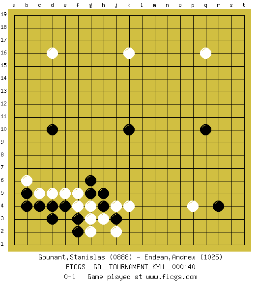 Last move : 0-1 2013 January 18 19:41:30 [Event "FICGS__GO__TOURNAMENT_KYU__000140 "] [Site "FICGS"] [Date "2013.01.03"] [Round "1"] [Black "Gounant,Stanislas "] [White "Endean,Andrew "] [Result "0-1"] [Rating 1 "0888"] [Rating 2 "1025"] 1.r4 d16 2.d3 q16 3.d10 k16 4.q10 d5 5.g6 f4 6.e4 e5 7.d4 f5 8.k10 k4 9.h4 h3 10.g5 g4 11.h5 j4 12.f3 g3 13.f2 g2 14.c4 c5 15.b5 b6 16.b4 p4 17.j3 j2 0-1 Here are the names of the openings (joseki) played in the four corners : Corner d4 : d3 d5Komoku (Somok, Xiao~mu`) 3-4 Point. The komoku (3-4) point is the traditional corner enclosure move..Ikken Takagakari (Hankan Nop'dakeolch'im, Yi Gaogua`jiao~, 1-Space High Approach). The 5-4 approach move has become more popular in modern times, as modern Go emphasizes speed and influence. Corner q4 : r4 p4Komoku (Somok, Xiao~mu`) 3-4 Point. The komoku (3-4) point is the traditional corner enclosure move..Ikken Takagakari (Hankan Nop'dakeolch'im, Yi Gaogua`jiao~, 1-Space High Approach). The 5-4 approach move has become more popular in modern times, as modern Go emphasizes speed and influence. Player White won this Go (weiqi, baduk) game.Follow this game move after move (download ) Keep away from thickness. (Anonymous) Fortune favours the audacious. (Desiderius Erasmus)