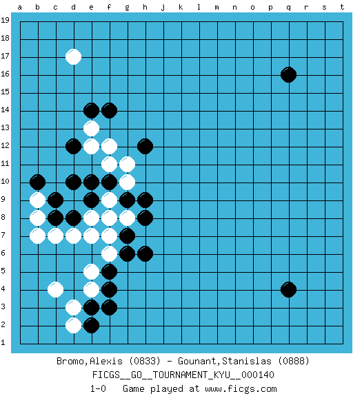 Last move : 1-0 2013 January 13 12:12:20 [Event "FICGS__GO__TOURNAMENT_KYU__000140"] [Site "FICGS"] [Date "2013.01.03"] [Round "1"] [Black "Bromo,Alexis"] [White "Gounant,Stanislas"] [Result "1-0"] [Rating 1 "0833"] [Rating 2 "0888"] 1.q16 c4 2.q4 d17 3.d10 f8 4.h6 d7 5.f5 e5 6.e3 d3 7.c8 c7 8.d8 e8 9.e9 b8 10.c9 b9 11.b10 b7 12.g9 g8 13.h8 f9 14.f10 e7 15.g7 d2 16.e2 e4 17.f4 f6 18.g6 f7 19.f3 g10 20.h9 f11 21.e10 g11 22.h12 e12 23.d12 f12 24.f14 e13 25.e14 1-0 Here are the names of the openings (joseki) played in the four corners : Player Black won this Go (weiqi, baduk) game. Follow this game move after move (download)Very few good moves are played. (Pierre Audouard) Be who you are, and say what you feel because those who mind don't matter, and those who matter don't mind. (Dr Seuss)