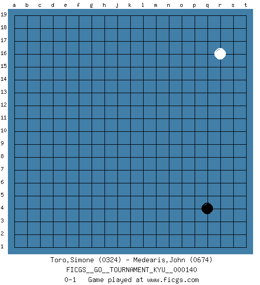 Last move : 0-1 2013 February 13 2:46:0 [Event "FICGS__GO__TOURNAMENT_KYU__000140"] [Site "FICGS"] [Date "2013.01.03"] [Round "1"] [Black "Toro,Simone"] [White "Medearis,John"] [Result "0-1"] [Rating 1 "0324"] [Rating 2 "0674"] 1.q4 r16 0-1 This go game has been lost on time (started : 2013.01.03 23:7:44) Here are the names of the openings (joseki) played in the four corners : Player White won this Go (weiqi, baduk) game. Follow this game move after move (download)Don't overlook the edge of the board. (Anonymous) All the biggest technological inventions created by man - the airplane, the automobile, the computer - says little about his intelligence, but speaks volumes about his laziness. (Mark Kennedy)