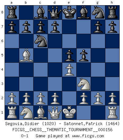 Last move : 0-1 2013 February 14 2:46:55 [Event "FICGS__CHESS__THEMATIC_TOURNAMENT__000156"] [Site "FICGS"] [Date "2013.01.04"] [Round "1"] [White "Segovia,Didier"] [Black "Satonnet,Patrick"] [Result "0-1"] [WhiteElo "1020"] [BlackElo "1464"] 1.e4 e5 2.Nf3 Nc6 3.Bb5 f5 0-1 This chess game has been lost on time (started : 2013.01.04 19:45:21) Ruy Lopez : Schliemann defense Player Black won this chess game. Follow this game move after move (download)Chess teaches you to control the initial excitement you feel when you see something that looks good and it trains you to think objectively when you're in trouble. (Stanley Kubrick) Capablanka war das größte Genie der Schachgeschichte! Aber denken sie nicht er habe nichts vom Schach verstanden. Er wusste nur soviel wie er wissen musste um seine Ziele zu erreichen. (Mikhail Moiseyevich Botvinik) El Ajedrez es sobre todo, ¡una pelea!. (Emanuel Lasker) Aidez vos pièces, elles vous aideront. (Paul Morphy) However beautiful the strategy, you should occasionally look at the results. (Winston Churchill)