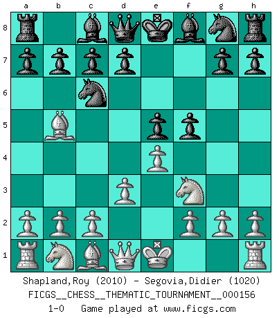 Last move : 1-0 2013 February 16 2:49:18 [Event "FICGS__CHESS__THEMATIC_TOURNAMENT__000156"] [Site "FICGS"] [Date "2013.01.04"] [Round "1"] [White "Shapland,Roy"] [Black "Segovia,Didier"] [Result "1-0"] [WhiteElo "2010"] [BlackElo "1020"] 1.e4 e5 2.Nf3 Nc6 3.Bb5 f5 4.d3 1-0 This chess game has been lost on time (started : 2013.01.04 19:45:21) Ruy Lopez : Schliemann defense Player White won this chess game. Follow this game move after move (download)Chess holds its master in its own bonds, shackling the mind and brain so that the inner freedom of the very strongest must suffer. (Albert Einstein) Kleine Schachspieler machen Mist, und große Schachspieler machen Mist, aber große machen weniger Mist. (Fritz Sämisch) Cuando veas una buena jugada, trata de encontrar otra mejor. (Emanuel Lasker) Le jeu d'échecs est comme rejeté hors du temps. (Antoine de Saint-Exupéry) Opportunities multiply as they are seized. (Sun Tzu)
