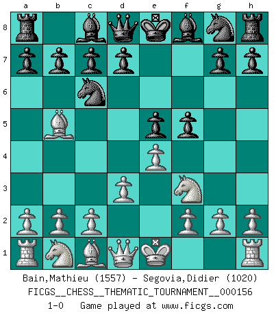 Last move : 1-0 2013 February 14 2:46:55 [Event "FICGS__CHESS__THEMATIC_TOURNAMENT__000156"] [Site "FICGS"] [Date "2013.01.04"] [Round "1"] [White "Bain,Mathieu"] [Black "Segovia,Didier"] [Result "1-0"] [WhiteElo "1557"] [BlackElo "1020"] 1.e4 e5 2.Nf3 Nc6 3.Bb5 f5 4.d3 1-0 This chess game has been lost on time (started : 2013.01.04 19:45:21) Ruy Lopez : Schliemann defense Player White won this chess game. Follow this game move after move (download)Fischer is an American Chess tragedy on par with Morphy and Pillsbury. (Mig Greengard) Oft bringt ein stiller Zug das Erdbeben. (Richard Reti) Vive, pierde y aprende al observar a tu oponente como gana. (Amber Steenbock) Il a essayé de se convaincre qu'il pourrait empêcher toutes les erreurs et ne jamais perdre. L'horreur ! Gary Kasparov au sujet de Robert Fischer. Without enthusiasm, virtue functions not at all, and vice only poorly. (Mignon McLaughlin, The Neurotic's Notebook, 1960)