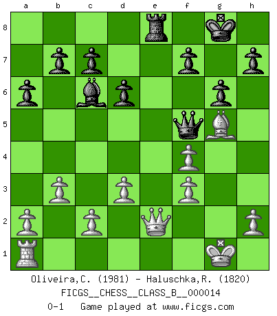 Last move : 0-1 2007 April 17 22:1:47 [Event "FICGS__CHESS__CLASS_B__000014"] [Site "FICGS"] [Date "2007.01.23"] [Round "1"] [White "Oliveira,Carlos"] [Black "Haluschka,Rainer"] [Result "0-1"] [WhiteElo "1981"] [BlackElo "1820"] 1.e3 Nf6 2.b3 g6 3.Bb2 Bg7 4.f4 Nc6 5.Nf3 d6 6.Bb5 Bd7 7.O-O a6 8.Bxc6 Bxc6 9.d3 O-O 10.Nbd2 Nd5 11.Bxg7 Nxe3 12.Qe2 Nxf1 13.Bxf8 Nxd2 14.Bxe7 Nxf3+ 15.gxf3 Qd7 16.Bf6 Qf5 17.Bg5 Re8 0-1 Van't Kruijs Opening Kingside Castling by player White (move 7) Kingside Castling by player Black (move 9) Player Black won this chess game. Follow this game move after move (download)All Chess players should have a hobby. (Savielly Tartakower) Sie führen leise Selbstgespräche, schlürfen lautstark ihre Getränke, schmatzen hörbar beim Essen, blasen ihrem Gegenüber Rauch in die Augen, niesen ihm ins Gesicht, starren ihn unverwandt an, bis er sich unter ihren Blicken windet, rutschen ständig auf ihrem Stuhl hin und her, rülpsen und bohren in der Nase. (Anonymous) La belleza de un movimiento no se refleja solo en su apariencia, sino en el pensamiento detrás de él. (Siegbert Tarrasch) Les Echecs mettent en conflit, non pas deux intelligences, mais deux volontés. (Lasker) Cactus - It is depressed cucumber. (Ilmars Cirulis)