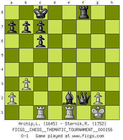 Last move : 0-1 2013 February 12 7:3:34 [Event "FICGS__CHESS__THEMATIC_TOURNAMENT__000156"] [Site "FICGS"] [Date "2013.01.04"] [Round "1"] [White "Archip,Laurentiu"] [Black "Sternik,Ryszard"] [Result "0-1"] [WhiteElo "1645"] [BlackElo "1752"] 1.e4 e5 2.Nf3 Nc6 3.Bb5 f5 4.exf5 e4 5.Qe2 Qe7 6.Bxc6 dxc6 7.Nd4 Nh6 8.Nc3 Nxf5 9.Nxf5 Bxf5 10.O-O O-O-O 11.Re1 Re8 12.b3 Qe5 13.Qe3 Bc5 14.Qg5 Rhf8 15.d3 Qxc3 16.Be3 Bxe3 17.fxe3 exd3 18.cxd3 Bxd3 19.Rac1 Qb2 20.Rcd1 Qf2+ 21.Kh1 Be2 22.Rc1 Rxe3 23.Qxg7 h5 24.Qg3 Rxg3 25.hxg3 h4 26.gxh4 Qxh4+ 27.Kg1 Qf2+ 0-1 Ruy Lopez : Schliemann defense Kingside Castling by player White (move 10) Queenside Castling by player Black (move 10) Player Black won this chess game. Follow this game move after move (download)Blessed be the memory of him who gave the world this immortal game. (A. G. Gardiner) Ich verachte Kasparow. (Viktor Kortschnoi) Un Peón pasado es un criminal, quién debe ser mantenido bajo candado y llave. Leves medidas, tales como vigilancia policiaca, no son suficientes. (Aaron Nimzovich) Fischer est le meilleur joueur du monde et Karpov n'est qu'un joueur de bistrot. (Garry Kasparov, agé de 16 ans) Knowledge rests not upon truth alone, but upon error also. (Carl G. Jung)