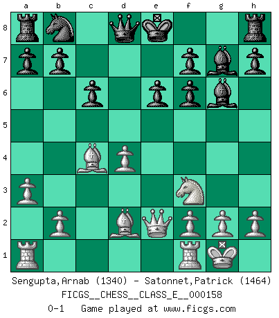 Last move : 0-1 2013 April 4 20:30:35 [Event "FICGS__CHESS__CLASS_E__000158"] [Site "FICGS"] [Date "2013.01.07"] [Round "1"] [White "Sengupta,Arnab"] [Black "Satonnet,Patrick"] [Result "0-1"] [WhiteElo "1340"] [BlackElo "1464"] 1.e4 d5 2.exd5 Qxd5 3.Nc3 Qa5 4.d4 Nf6 5.Nf3 Bf5 6.Bc4 c6 7.Bd2 e6 8.Nd5 Qd8 9.Nxf6+ gxf6 10.Qe2 Bxc2 11.O-O Bg6 12.a3 Bg7 0-1 Scandinavian defense Kingside Castling by player White (move 11) Player Black won this chess game. Follow this game move after move (download)With or without the title, Bobby Fischer was unquestionably the greatest player of his time. (Burt Hochberg) Schach ist eine Sache der genauen Beurteilung, wann man zuschlagen und wann man sich ducken muss. (Robert James Fischer) Una partida de Ajedrez se divide en 3 etapas: la primera cuando piensas que tienes la ventaja, la segunda cuando crees que tienes la ventaja y la tercera... ¡cuando te das cuenta que vas a perder!. (Savielly Tartakower) Toutes les manuvres exécutées sur une colonne ouverte ont pour but ultime l'intrusion définitive sur la septième ou la huitième rangée, en plein cur de la position ennemie. (Aaron Nimzovitch) The greatest con, that he ever pulled... was making you believe... that he is you. (Revolver, movie)