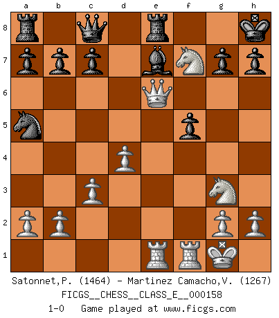Last move : 1-0 2013 February 4 5:6:8 [Event "FICGS__CHESS__CLASS_E__000158"] [Site "FICGS"] [Date "2013.01.07"] [Round "1"] [White "Satonnet,Patrick"] [Black "Martinez Camacho,Victor Hugo"] [Result "1-0"] [WhiteElo "1464"] [BlackElo "1267"] 1.d4 e6 2.e4 d5 3.Be3 dxe4 4.Nd2 Nf6 5.f3 exf3 6.Ngxf3 Nc6 7.c3 Be7 8.Bc4 Bd7 9.Qe2 O-O 10.O-O Nd5 11.Rae1 Re8 12.Ne4 f5 13.Ng3 Nxe3 14.Qxe3 Na5 15.Bxe6+ Bxe6 16.Qxe6+ Kh8 17.Ne5 Qc8 18.Nf7+ 1-0 Queen's pawn Kingside Castling by player Black (move 9) Kingside Castling by player White (move 10) Player White won this chess game. Follow this game move after move (download)A good player is always lucky. (Jose Raul Capablanca) Deine Wertungszahl - vorausgesetzt einige Jahre schachliche Anstrengung - entspricht etwa dem zehnfachen Deines IQ plus 1000. (Jonathan Levitt) Por tratar de evitar la pérdida de una pieza, muchas personas han perdido una partida de Ajedrez. (Savielly Tartakover) Il n'y a pas de prix trop élevé au scalp de l'ennemi. (Koblentz) Art is the only way to run away without leaving home. (Twyla Tharp)