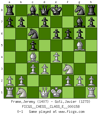 Last move : 0-1 2013 February 4 19:28:33 [Event "FICGS__CHESS__CLASS_E__000158"] [Site "FICGS"] [Date "2013.01.07"] [Round "1"] [White "Frame,Jeremy"] [Black "Goti,Javier"] [Result "0-1"] [WhiteElo "1407"] [BlackElo "1273"] 1.e4 c5 2.Nf3 Nc6 3.Bc4 g6 4.c3 Bg7 5.d3 e6 6.Bg5 f6 0-1 Sicilian defense Player Black won this chess game. Follow this game move after move (download)As one by one I mowed them down, my superiority soon became apparent. (Jose Capablanca) Das Schachspiel hat wie die Liebe, die Musik, die Fähigkeit, den Menschen glücklich zu machen. Ich habe ein leises Gefühl des Bedauerns für jeden, der das Schachspiel nicht kennt, so wie ich jeden bedaure, der die Liebe nicht kennt. (Siegbert Tarrasch) Coloca el contenido del tablero de Ajedrez en un sombrero, agita las piezas vigorosamente, derrámalas en el tablero desde una altura de medio metro y así obtienes el estilo de Wilhelm Steinitz. (H. E. Bird) Les Cavaliers se révèlent fort utiles dans les positions fermées. D'habitude, les Fous sont un peu plus forts que les Cavaliers dans les positions ouvertes. Qu'on le veuille ou non, il restera toujours des exceptions ! Luck has a peculiar habit of favoring those who don't depend on it. (Author unknown)
